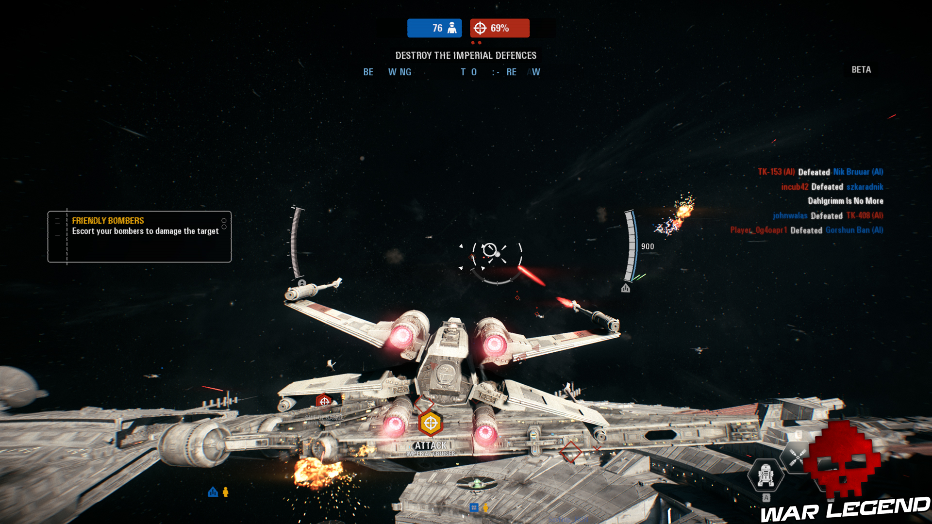Nouvelle fonctionnalité de base attendue pour ce deuxième épisode, les batailles spatiales font leur grand retour dans Star Wars: Battlefront II. Étant donné que le jeu reste destiné à être accessible au grand public, pas mal d’aides au pilotage sont présentes pour assister le joueur à ne pas être désorienté pendant ses manoeuvres, mais quand vous avez l’habitude des simulations ou des titres plus arcade, mais toutefois exigeants comme Star Wars: Rogue Squadron ou Ace Combat, on peut ressentir la désagréable sensation de ne pas être libre dans son pilotage. La faute tout d’abord la correction automatique d’assiette. En effet, quand l’option est activée par défaut, votre vaisseau essaiera toujours de revenir dans l’axe du plan de la carte, ce qui est assez débile dans une bataille spatiale ou le haut et le bas n’existe pas. Faire un simple demi-tour peut devenir alors laborieux et peu efficace, pas l’idéal quand un chasseur Tie vous colle au train.
