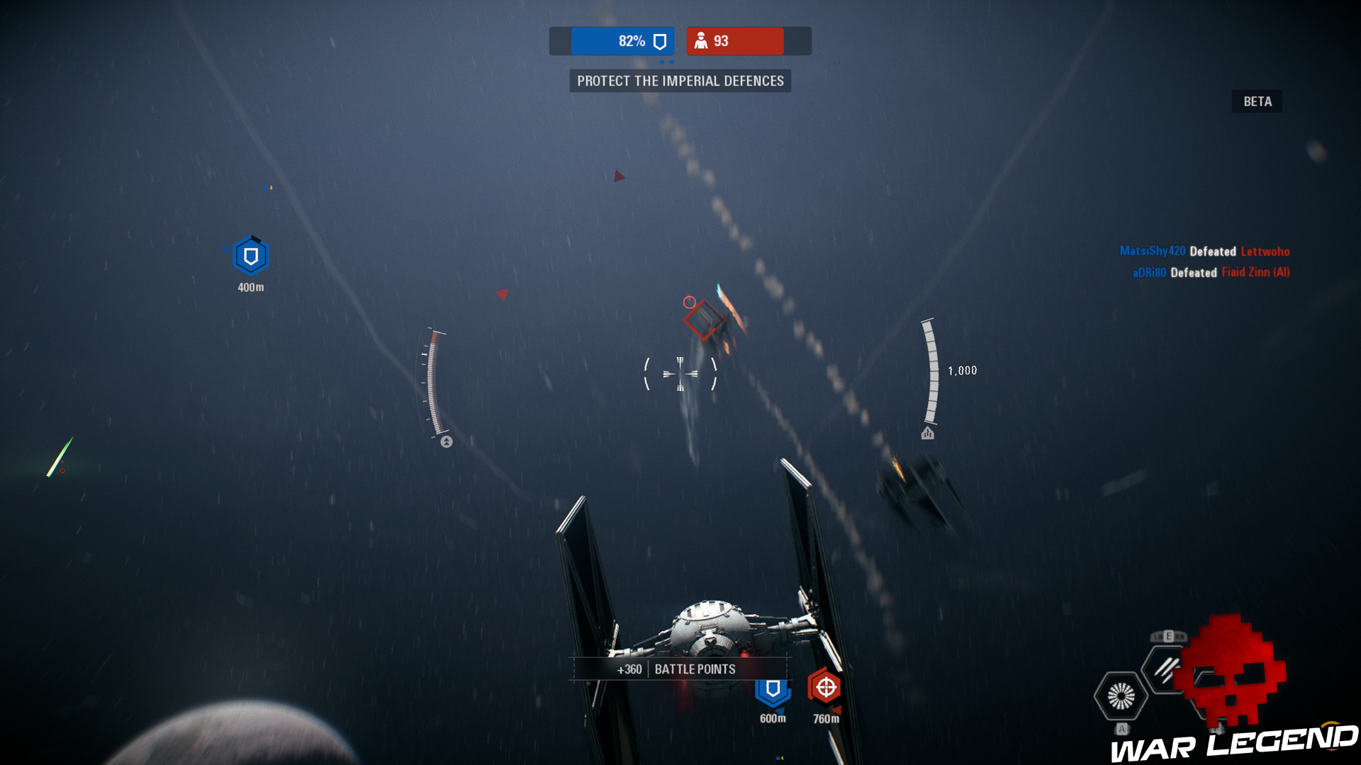 Mais le truc qui fait que la souris est reine est la possibilité d’affiner vos tirs indépendamment des mouvements du vaisseau. Votre pointeur dirige également l’orientation des canons laser de votre vaisseau jusqu’à un certain degré. Ce petit espace de liberté vous permet de tirer très précisément dans le cercle d’anticipation (angle de tir optimal pour le temps de voyage des lasers). Si votre cible est très près, tirer le plus loin possible devant elle, l’alignement de vos canons se confondra alors avec votre proie avec le bon angle. Observez bien les trajets vos tirs. Essayer, c’est l’adopter : je suis passé de joueur moyen avec la manette à premier sur toutes les parties en domptant une heure ou deux les commandes à la souris, devenant redoutable de précisions dans les manoeuvres, comme dans les alignements au tir.