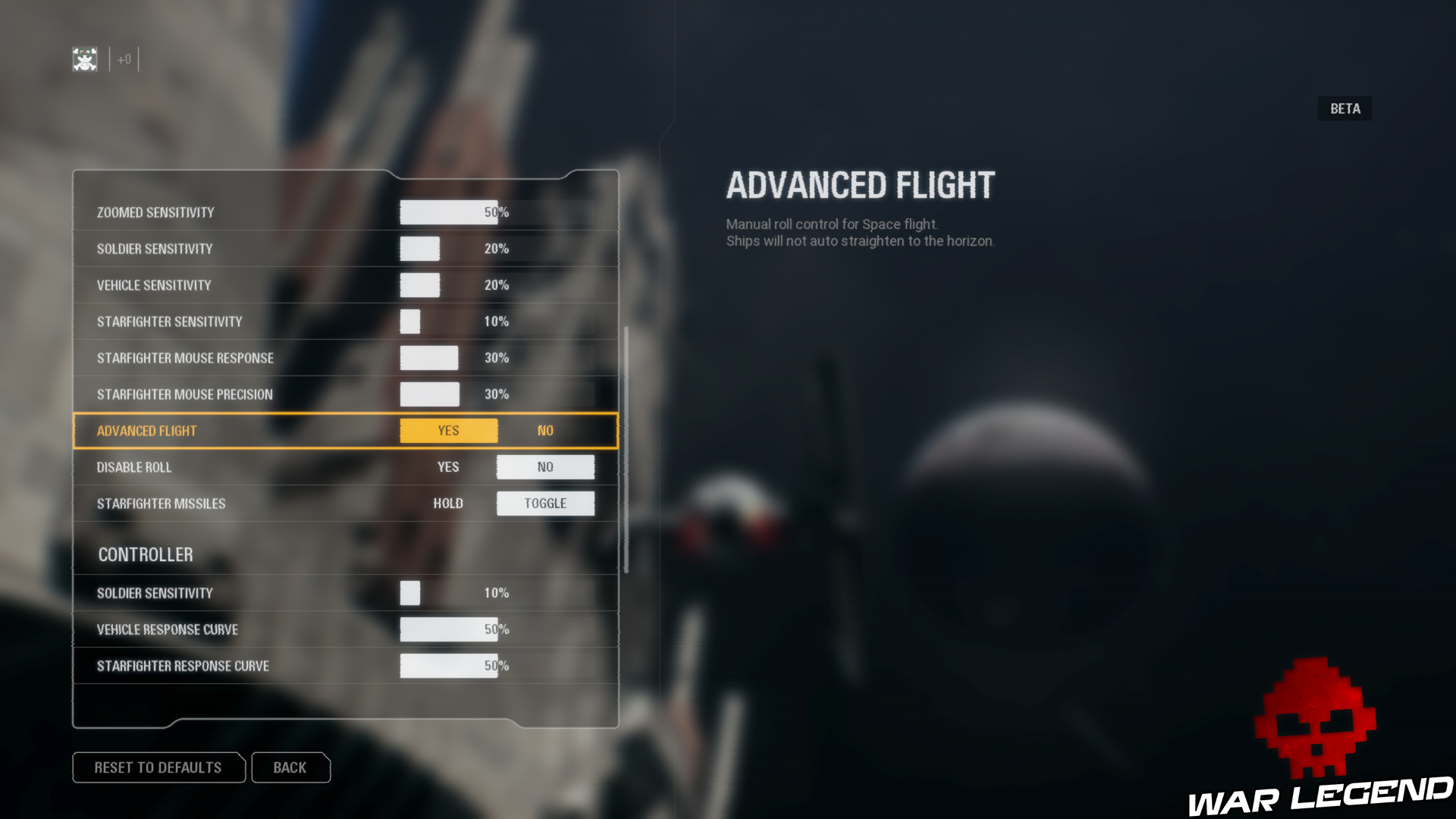 Si vous désirez avoir un contrôle plus complet de votre aéronef, il vous faudra aller dans les options et activer le « vol avancé » (advanced flight). Ainsi, le roulis (rouler sur soi-même) de votre vaisseau ne se fera plus automatiquement et ne sera plus corrigé, et devra être géré manuellement. Si vous savez déjà à peu près commence se pilote un avion, vous n’aurez pas trop de problèmes… pour les autres, accrochez-vous à ces commandes et entraînez-vous. La meilleure méthode pour tourner sera toujours de rouler à 90° sur votre flanc gauche ou droit et de monter le nez de votre vaisseau. Non seulement c’est tout de suite plus classe, mais cela vous permettra de tourner plus vite, et plus précisément dans les dogfights. Pour exécuter un virage plus serré, réduisez toujours les gaz. Ainsi, vous pourrez toujours garder votre proie en visuel ou exiger plus d’efforts à votre poursuivant pour rester dans votre sillage.
