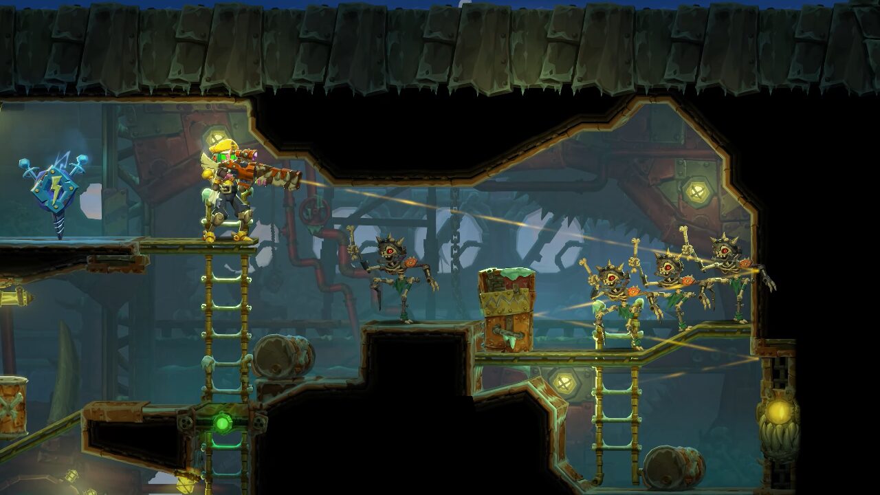 Steamworld Heist 2 se déroulera dans un univers très flotteux puisqu’il répondra au nom de la Grande Mer. Pirates, palmiers, soleil de plomb : tout s’y passerait comme sur des roulettes si l’eau ne s’était soudainement pas décidé à corroder tout ce qu’elle touche, rendant évidemment la vie de nos petits robots à vapeur fort complexe. Les joueurs devront donc recruter des alliés, remporter des batailles navales et même explorer les sept mers pour tenter d’élucider ce mystérieux phénomène. De l’eau qui fait rouiller ? Étrange en effet…