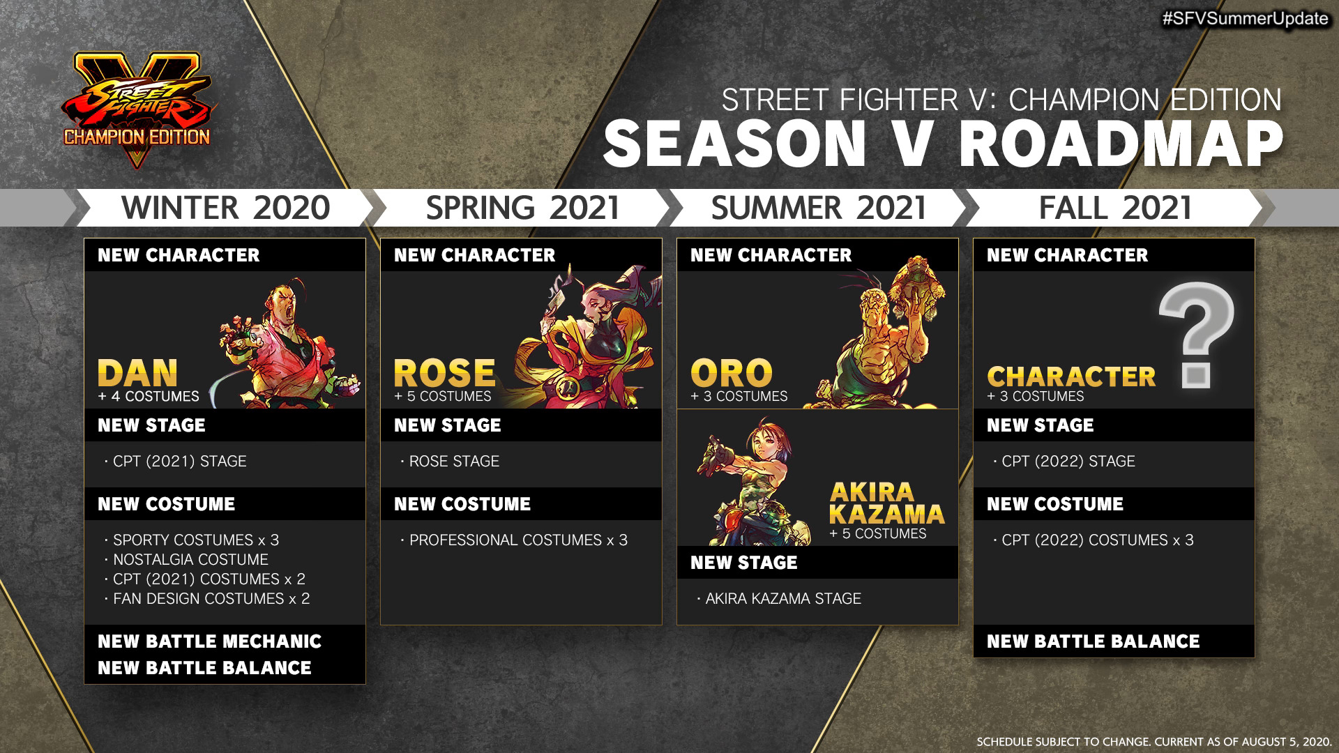 Le souci, c’est qu’en dehors d’une capture sur télé pourrie du gameplay de Dan, l’équipe ne semble pas avoir grand chose à montrer. Pourtant, la feuille de route indique pas mal de contenu intéressant, comme 3 nouveaux stages, de nouvelles mécaniques de combat, un nouvel équilibrage général et des costumes… plein de costumes. D’ailleurs, vous n’avez jamais tâté Street Fighter V ou avez lâché l’affaire quand il n’y avait que 12 personnages qui se battent en duel (vous l’avez ?), l’ensemble du roster est en essai gratuit durant les jours à venir.