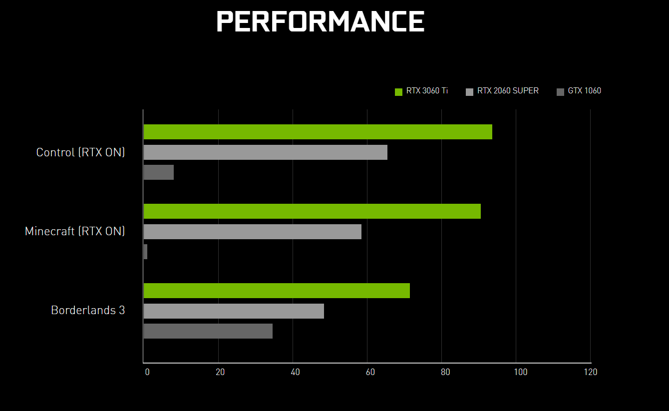 NVIDIA promet que la 3060 Ti représente un bond de performance impressionnant comparée aux générations précédentes, incarnées par la RTX 2060 Super et la GTX 1060.