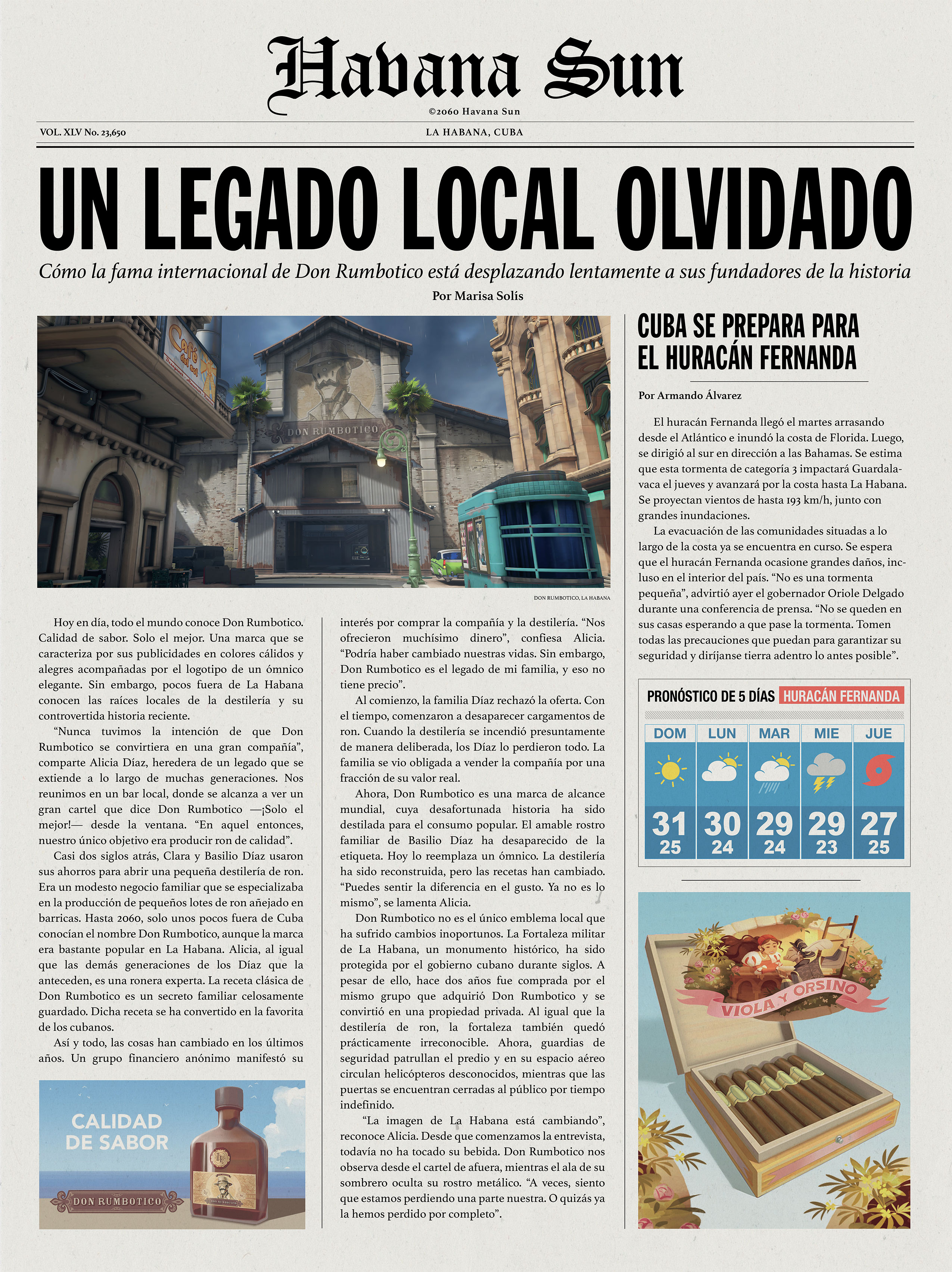 À présent, Don Rumbotico est présent dans le monde entier, et sa tragique histoire a été aseptisée pour le public. Sur l’étiquette, le visage souriant et familier de Basilio Diaz a laissé place à l’éclat du chrome. La distillerie a été reconstruite, mais les recettes ont changé. « On sent bien la différence. Ce n’est plus pareil, » s’attriste Alicia.