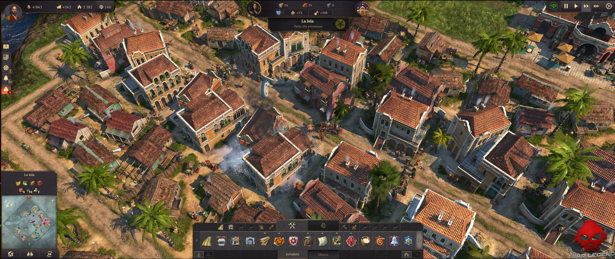 L’interface est probablement ce qui m’a le plus marqué, et c’est suffisamment rare pour le noter : tout est à portée de main, simple, intuitif et clair. D’un simple coup d’œil on aperçoit le bonheur global d’une île, la répartition de sa population, les quêtes en cours et les possibilités de construction en fonction de la catégorie de population. Pour les constructions les plus courantes, un clique droit fait apparaître une roue bien pratique. Par ailleurs, tous les menus sont très compréhensibles, notamment pour les besoins et satisfactions des colons.