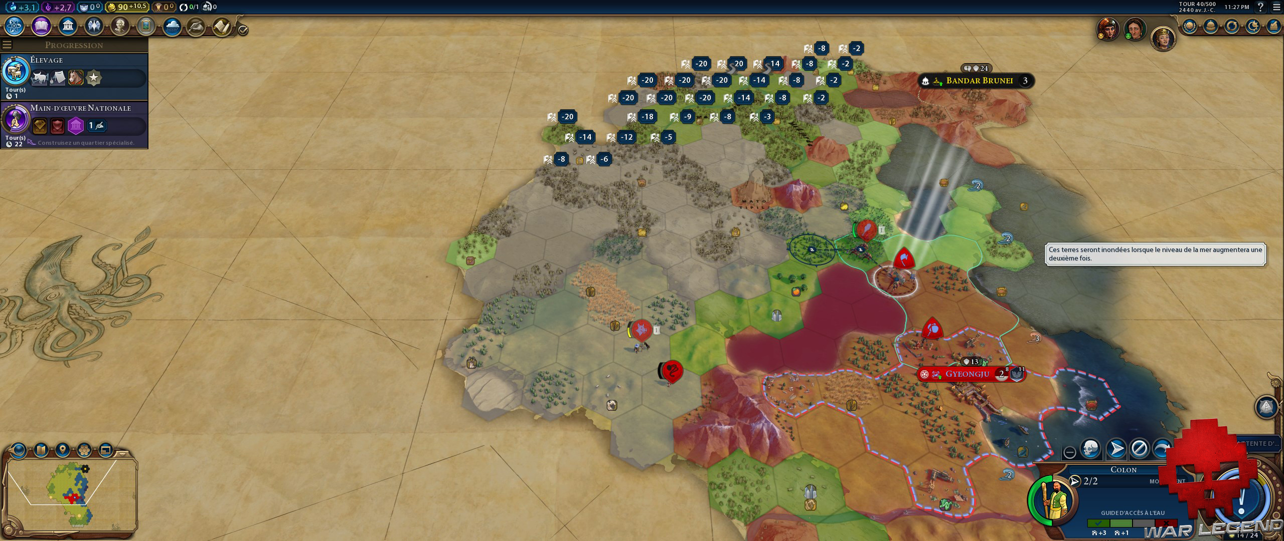 Très intéressant également, le réchauffement climatique fait son apparition et provoque 3 montées des eaux successives qui engloutiront des cases côtières, à moins que vous ne bâtissiez des digues anti-inondations. Si l’idée est bonne, elle n’est pas forcément très bien mise en place – une fois l’ère correspondant à la montée des eaux atteintes, vous disposez de très peu de temps pour découvrir la technologie renfermant les fameuses digues et les construire, tout en sachant que le coût en production grimpe (forcément) en fonction du nombre de cases à protéger et du niveau de production de la ville.