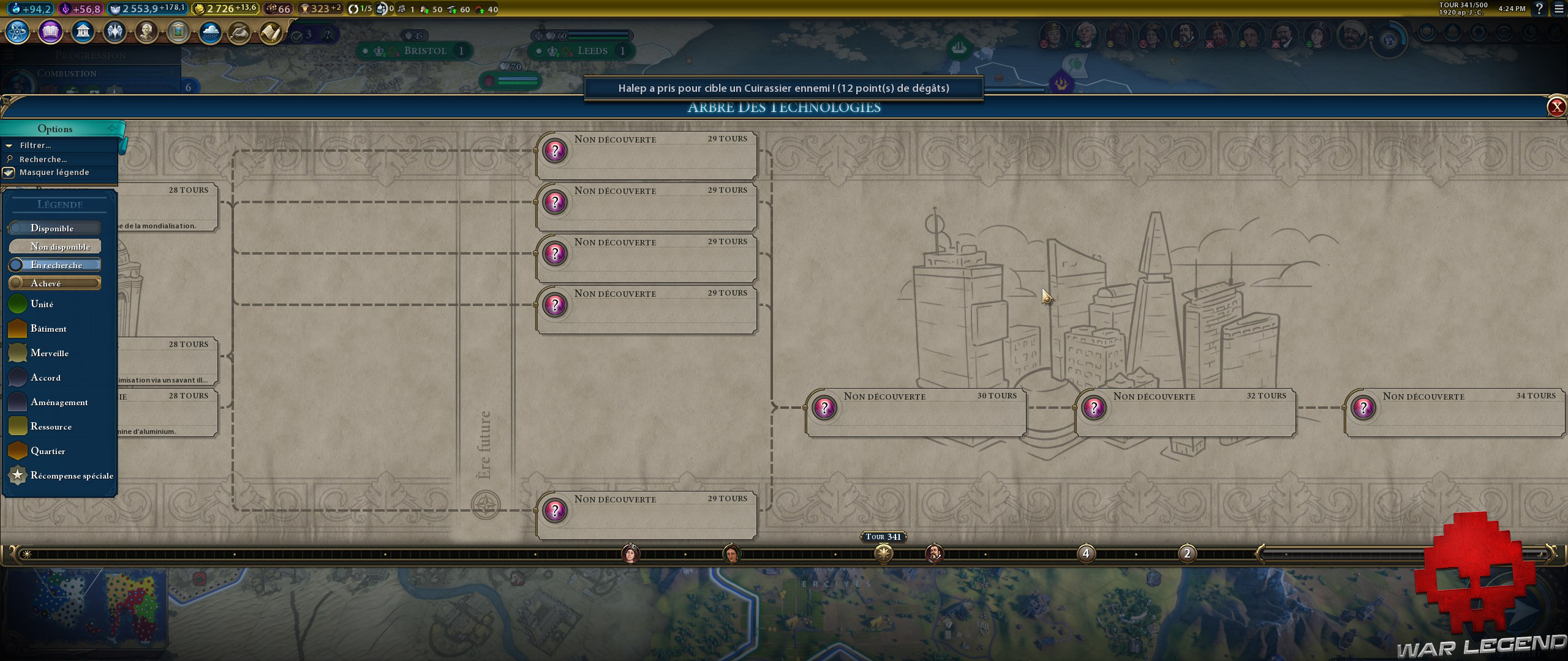 Directement liée au réchauffement climatique, l’électricité fait son apparition. Le charbon et le pétrole ainsi que l’uranium peuvent être consommés par des centrales pour donner des bonus supplémentaires à certains bâtiments (par exemple un laboratoire de recherche alimenté octroiera +7 en sciences ; +4 dans le cas contraire). Avec les avancées technologiques, vous pourrez passer à des énergies renouvelables, mais je n’ai pas encore joué de partie dans laquelle la montée des eaux était évitée ou ralentie.