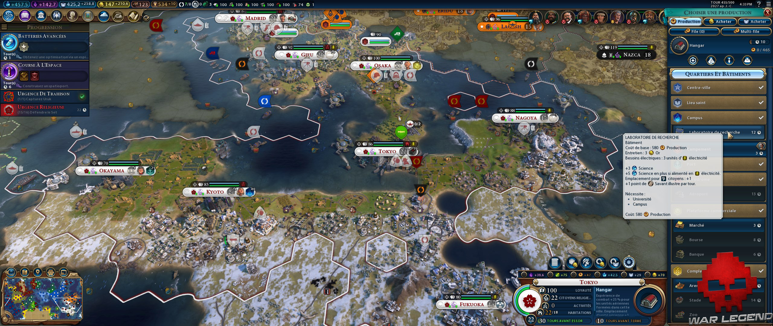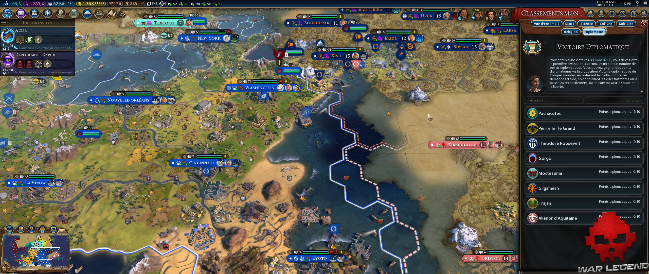 Régulièrement (très tôt d’ailleurs, peu importe que toutes les civilisations se connaissent ou non – nique la logique), un congrès mondial se réunit avec 2 propositions minimum (hors urgence) pour lesquelles vous DEVEZ donner votre avis en dépensant des faveurs diplomatiques. Un aspect un peu négatif, car si moi je m’en fous que pour 30 tours les unités militaires coûtent 2x plus ou moitié moins, je n’ai pas envie de claquer 10 faveurs (notons tout de même qu’elles ne sont consommées que si la motion votée est acceptée).
