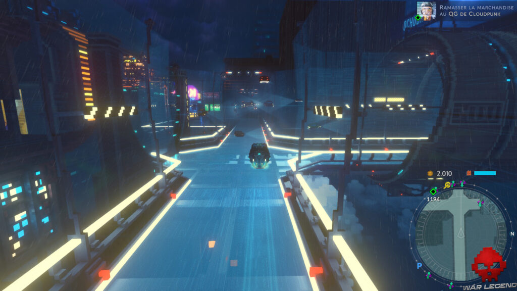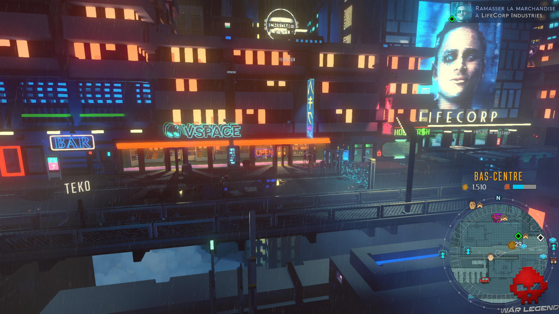 Cloudpunk se présente comme un jeu semi-ouvert avec de grandes zones interconnectées que vous pourrez explorer librement. Une feature qui n’apporte finalement pas grand-chose en dehors des missions de livraison, à part nous imposer des temps de chargement un poil longuets. Les plus collectionneurs d’entre nous pourront bien parcourir le monde à la recherche de tous les collectables, mais l’intérêt s’arrête ici.