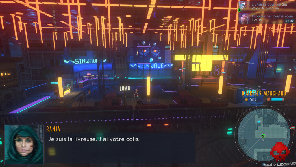 Au cours de ses livraisons, Rania sera amené à rencontrer de nombreux individus qui permettront au joueur d’en apprendre plus sur l’univers qui l’entoure via une multitude de dialogues. Car autant vous le dire tout de suite, Cloudpunk est avant tout un jeu narratif. Vous allez passer le plus clair de votre temps à discuter avec quelqu’un. Je ne dis pas que c’est une mauvaise chose en soi, d’autant que l’on en apprend beaucoup sur l’univers grâce à ça, mais cela pourra créer chez certaines personnes une sorte de frustration.