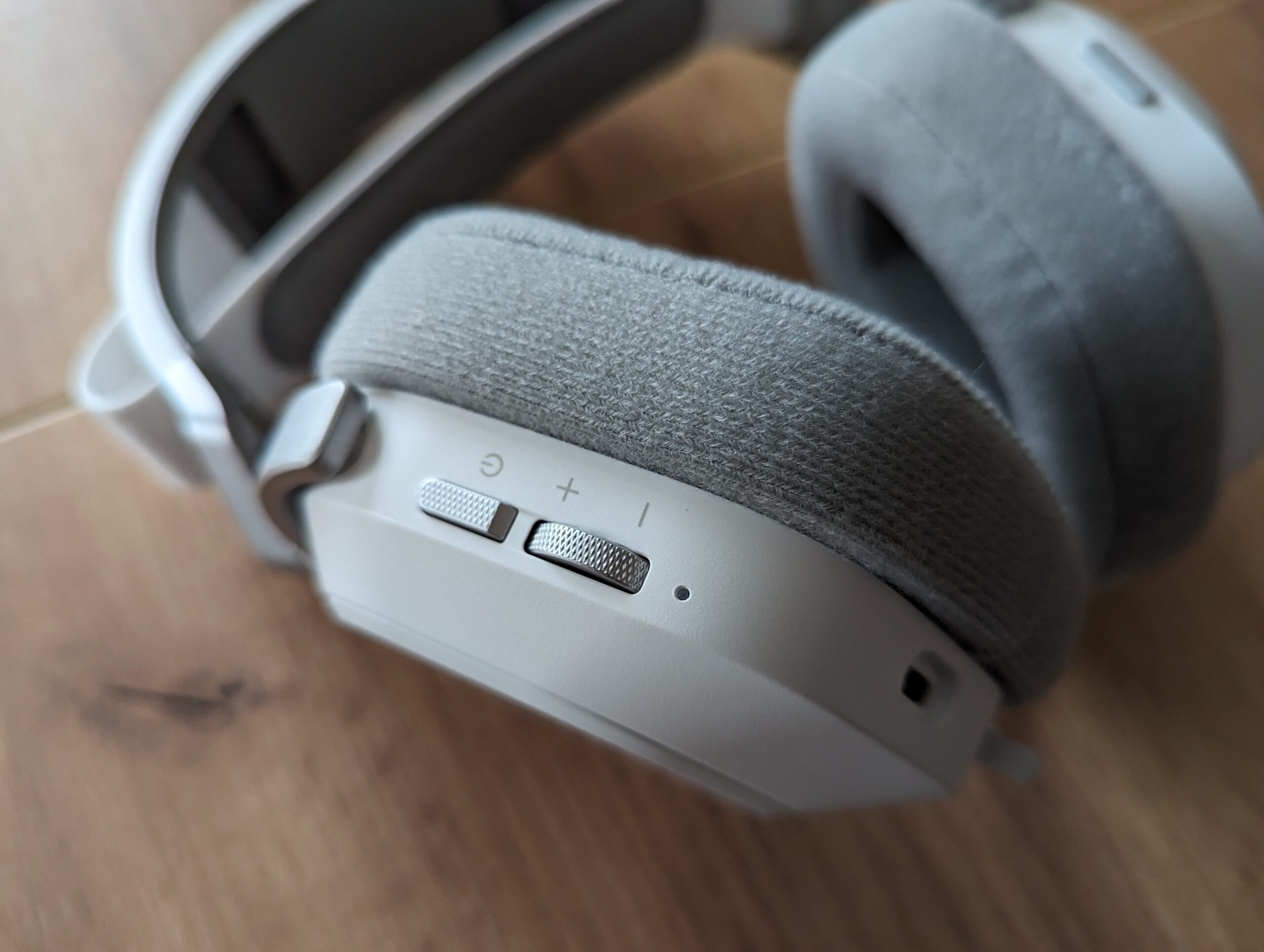 Côté boutons, on allume le casque via celui situé à l’arrière de l’oreillette gauche. Sous celui-ci se présente une molette pour le réglage du volume. Celle-ci est crantée, ce qui permet d’ajuster le son avec précision. Une petite LED montre quand à elle la mise sous tension du HS80 Max Wireless.