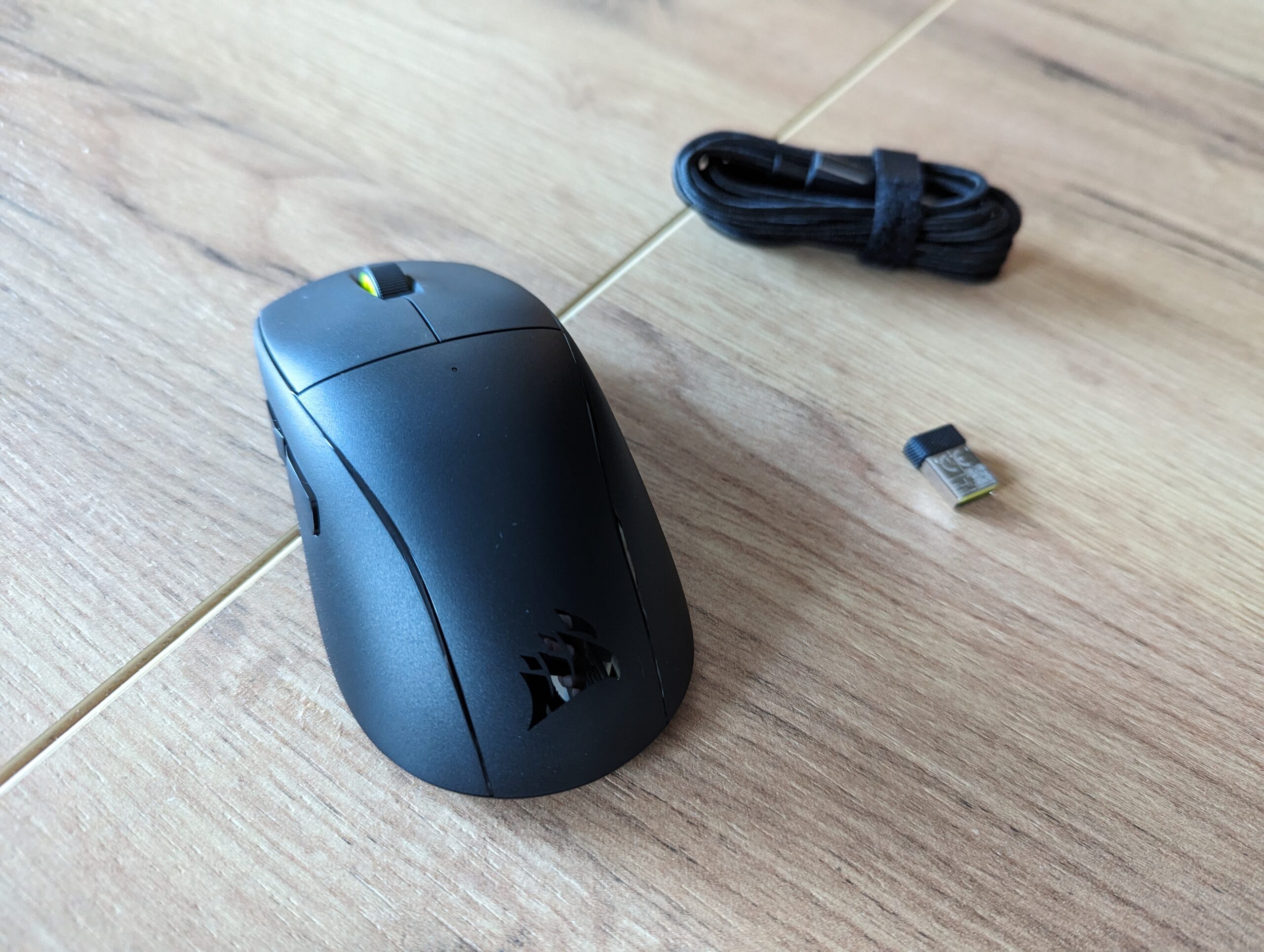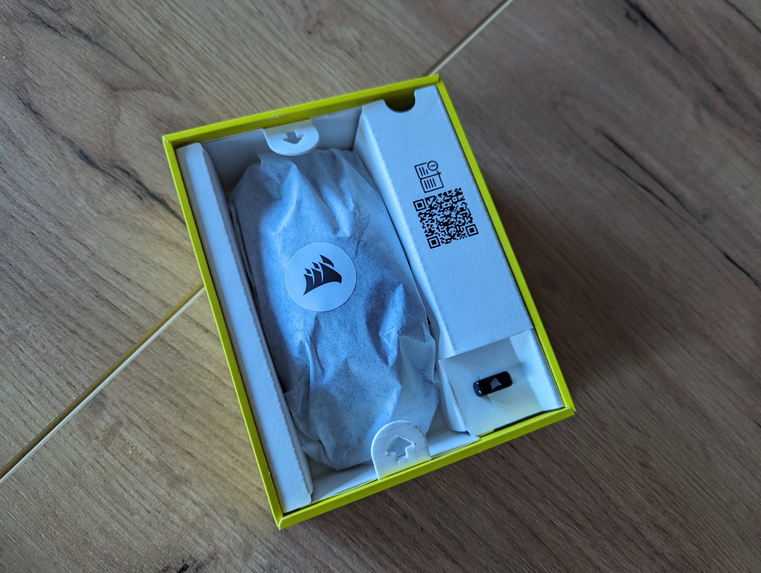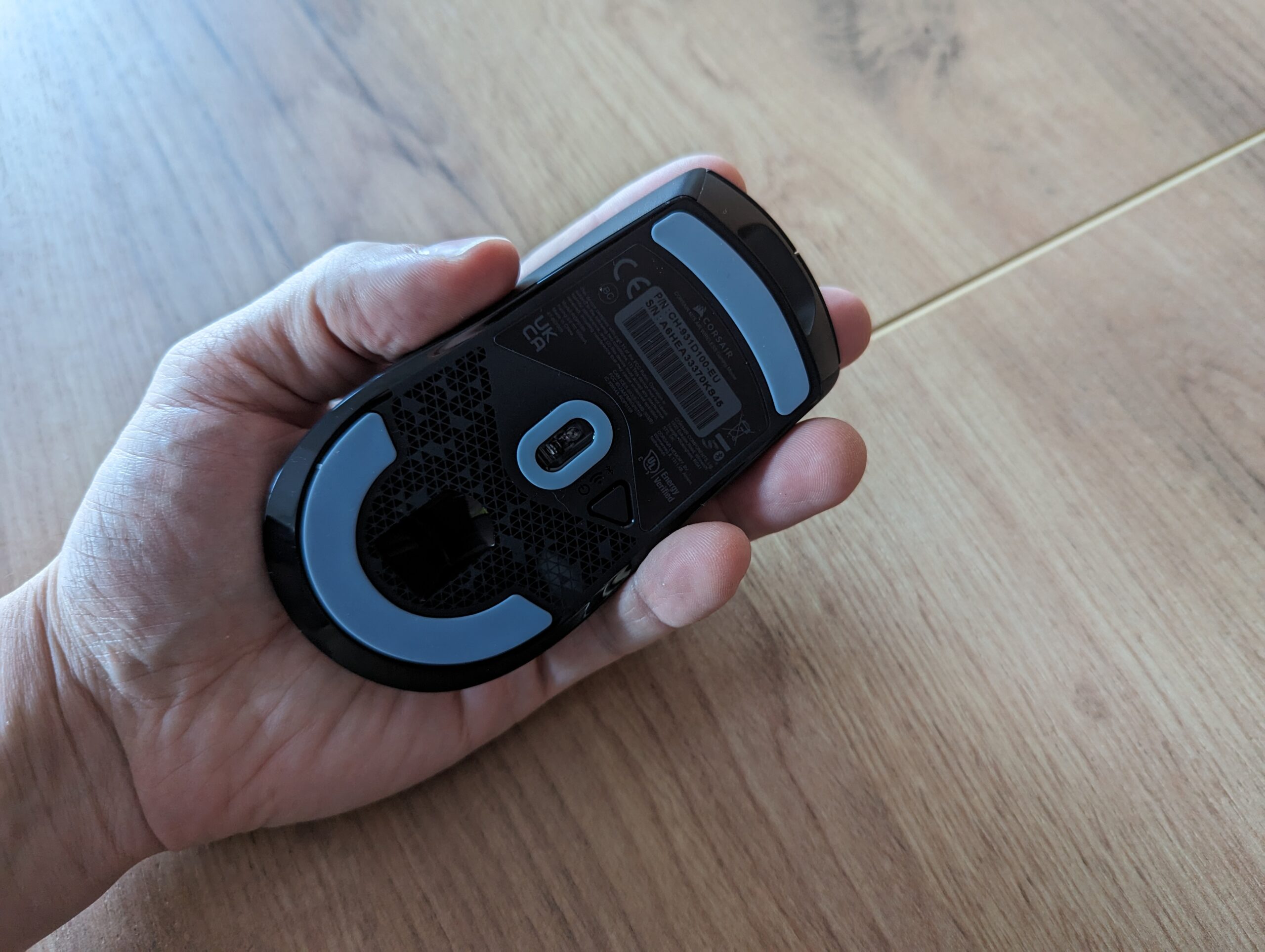 La M75 Air est très, très dépouillée, mais dans le bon sens du terme. Deux petites lignes en plastique brillant sillonnent la coque par ailleurs matte (en dehors du logo Corsair) et les seules touches de couleur seront le jaune de l’intérieur de la molette et la petite LED devant les 2 boutons principaux.