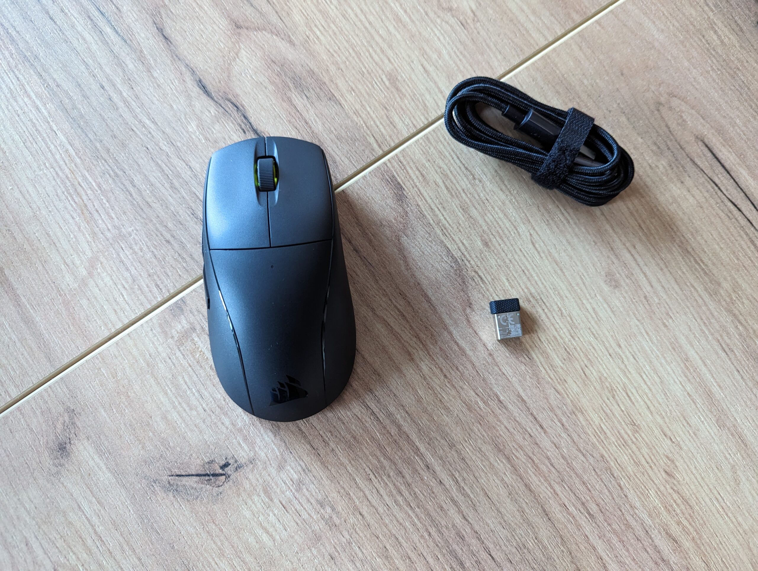 Dans la boîte, on retrouve aussi un câble USB-C pour recharger la souris ainsi qu’un dongle.
