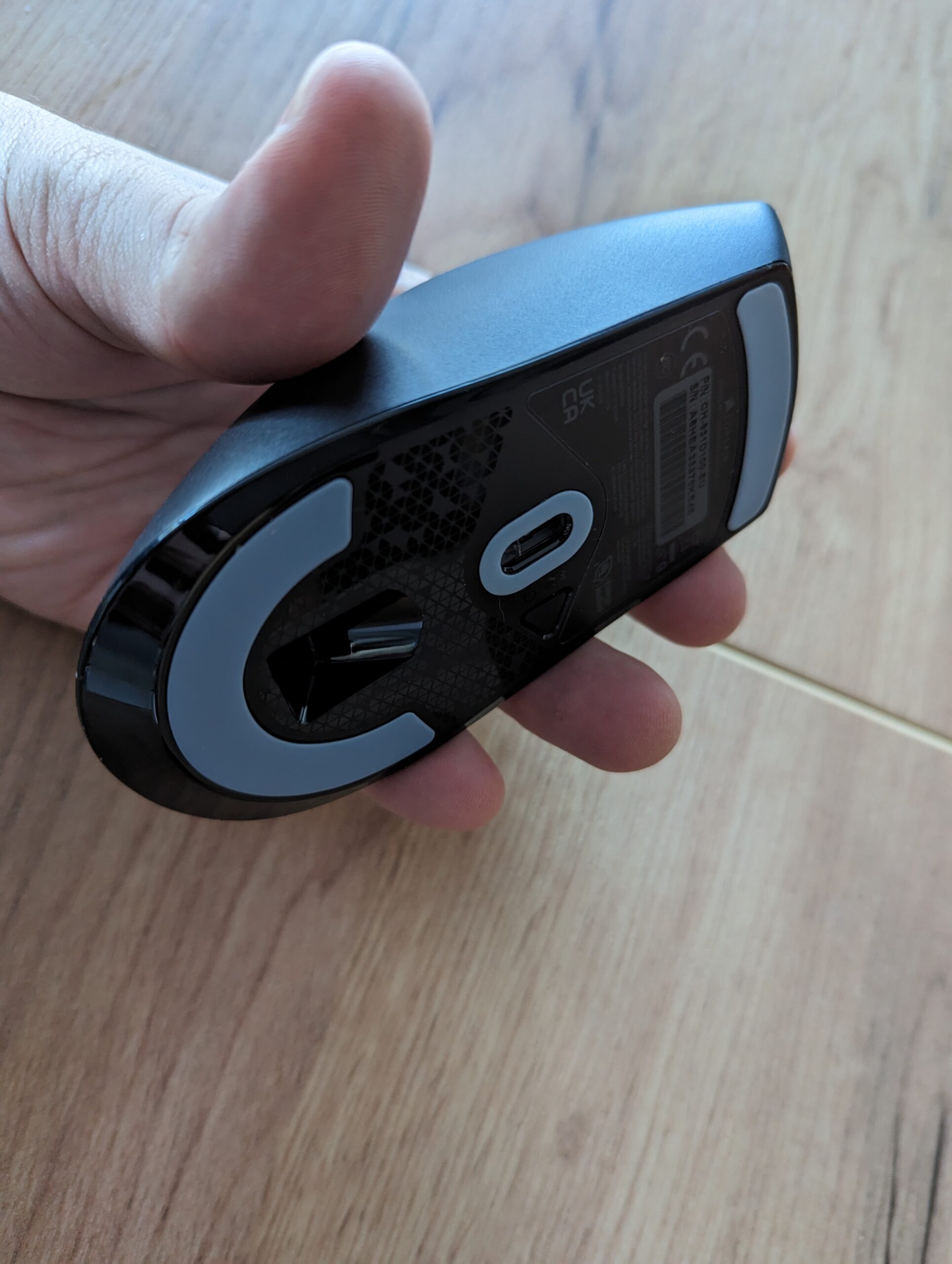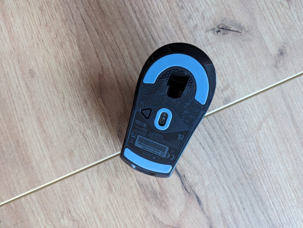 Sous la souris, on trouve un bouton qui permet d’allumer la souris et de switcher entre les différentes connectivités proposées : Bluetooth et 2,4 GHz. Notez qu’il est aussi possible de jouer en filaire grâce au câble fourni.