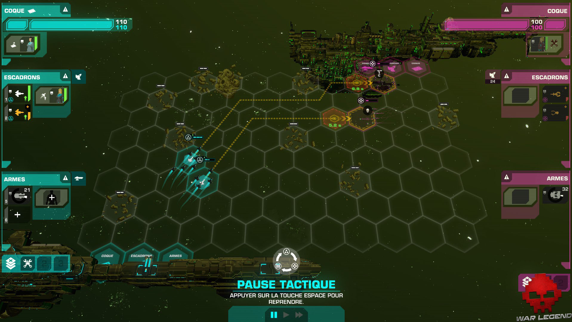 Chaque vaisseau doit alors gérer 3 éléments : les escadrons, les armes et la coque. Le principe de la coque est plutôt évident, je pense : si elle est détruite, vous êtes mort. Les armes se chargent après quelques dizaines de seconde et permettent de faire feu sur les escadrons ou le vaisseau adverses.