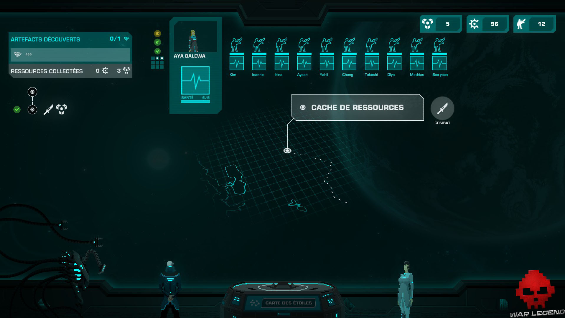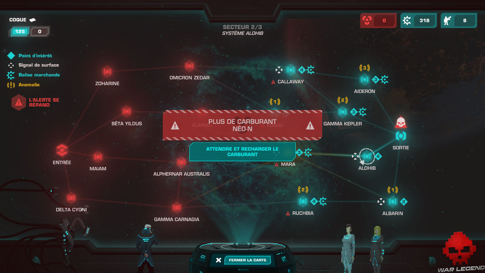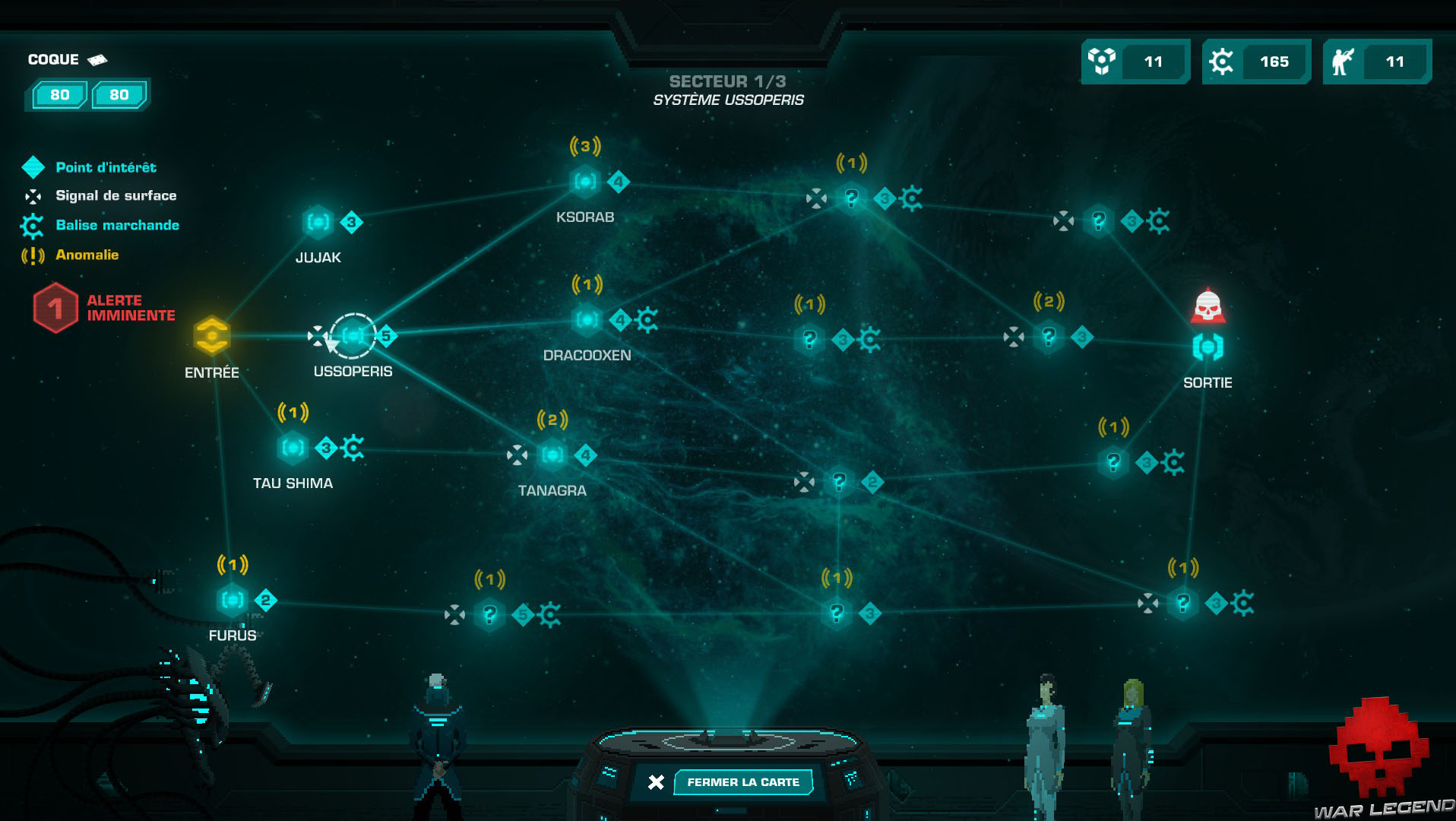 Grâce à la carte des étoiles qui m’a bien fait penser à Void Bastards comme il faut, vous pouvez choisir la route à emprunter en direction du boss de zone, tout à droite. Vous discernez à chaque fois le nombre d’anomalies, la présence de ferraille, mais surtout le nombre de planètes à explorer. Chacune a quelque chose à offrir, qu’il s’agisse d’un événement, d’un combat ou d’une expédition planétaire.