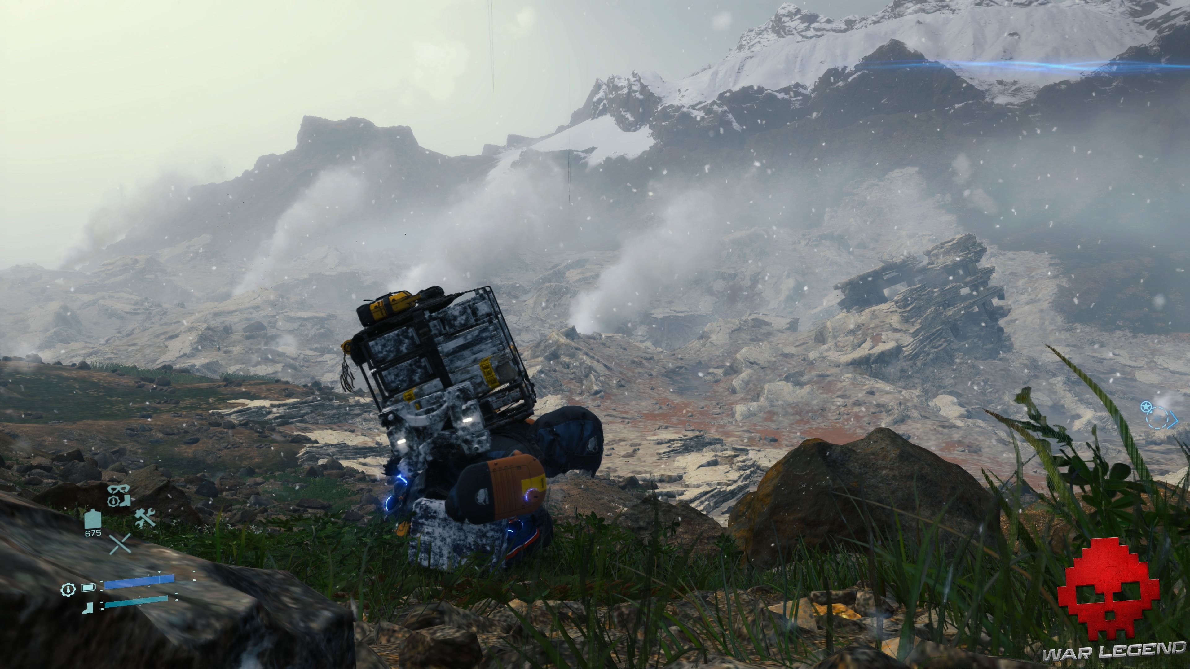 L’une des forces du gameplay de Death Stranding réside dans l’ajout progressif et régulier de nouveaux éléments pour vous faciliter la vie. Vous n’obtenez pas les véhicules immédiatement par exemple, puis vous en débloquez plusieurs types. Arrivent ensuite les exosquelettes, puis les tyroliennes, etc. jusqu’à ce que vous ayez tous les outils en main pour aller plus vite et devenir un véritable pionnier de certaines zones. J’ai vraiment pris plaisir à me taper une tempête infernale en montagne pour construire un réseau de tyroliennes qui transformèrent par la suite mes traversées d’1 demi-heure en voyages de 5 minutes.