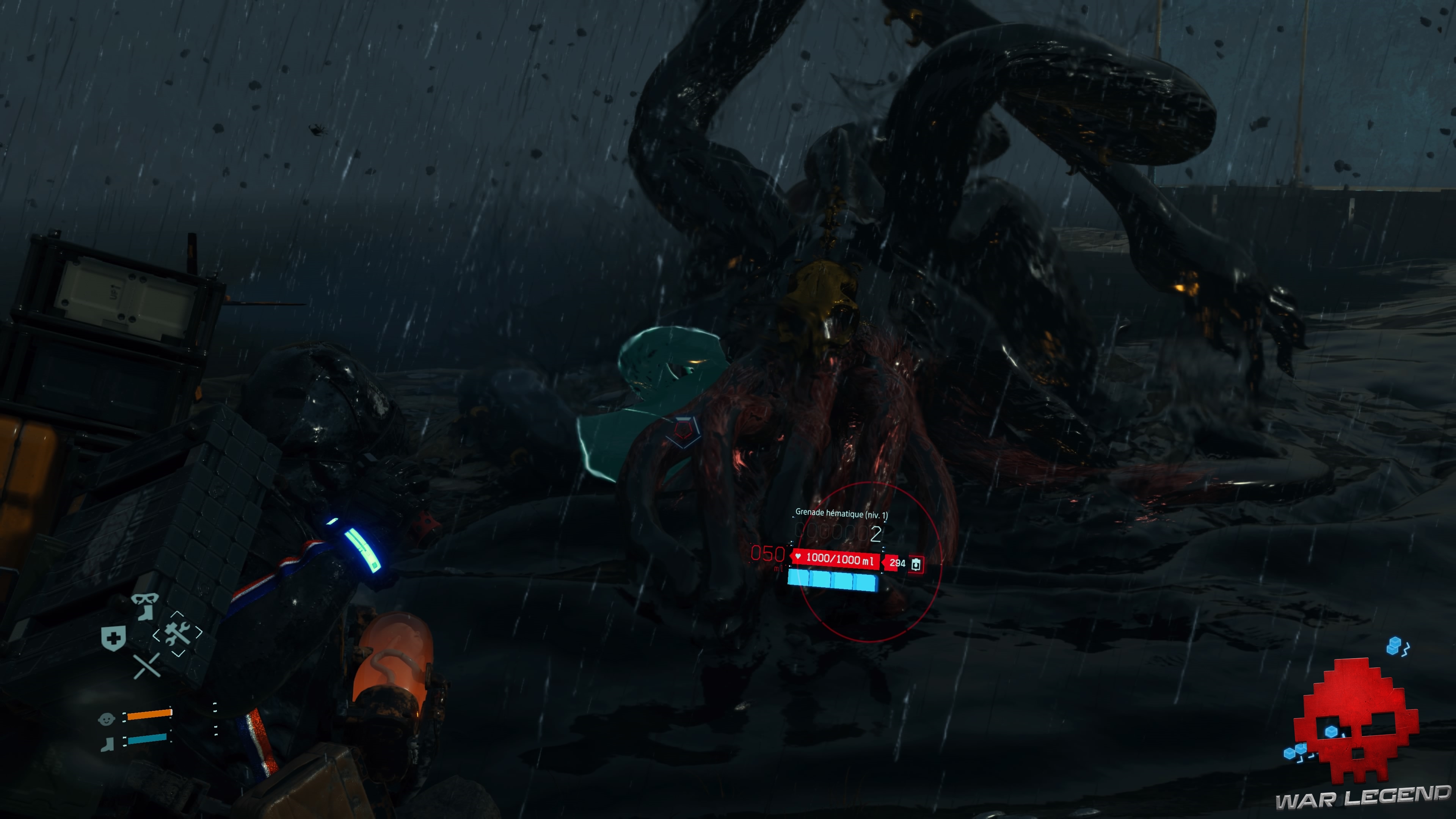 Et cela me permet d’aborder ce qui va moins avec le gameplay de Death Stranding. Au-delà des combats de mini-boss inintéressants (ce n’est pas le cas des véritables boss, pas incroyables mais plutôt sympas), il y a un soucis avec les armes du jeu. En effet très tôt vous débloquez un lance-bolas qui permet de ligoter instantanément les adversaires. Vous pouvez ensuite vous approcher et décocher un coup de pied pour assommer l’ennemi pour de bon. Quel intérêt alors de prendre un fusil d’assaut non létal qui réclamera pas loin d’un chargeur pour venir à bout d’un péquenot ? C’est bien simple, avec un seul lance-bolas, j’ai conquis tout un camp de terroristes armés jusqu’aux dents. La solution à tous les conflits armés du monde, bordel !
