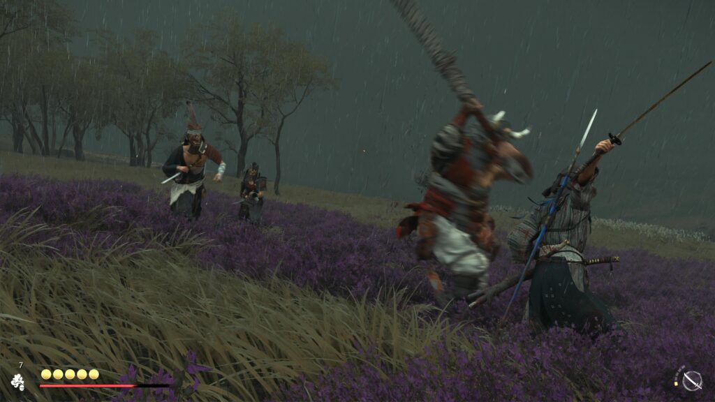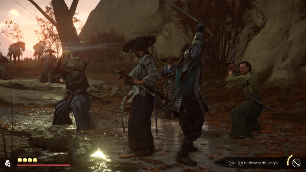 Le corps-à-corps a gagné en fluidité et en nervosité. Atsu manie le double sabre (katana et wakizashi) avec une dextérité qui ferait passer Jin Sakai pour un charretier. Les postures sont toujours de la partie pour briser les gardes, mais le système a été assoupli pour permettre des transitions plus naturelles. On danse littéralement entre les adversaires. J’avais peur que le jeu devienne trop bourrin, mais la difficulté est au rendez-vous (surtout en mode Letal). Les ennemis ne font pas la queue leu-leu pour se faire découper ; ils attaquent en groupe, tentent de vous contourner, et les chiens de garde sont de véritables plaies qu’il faudra gérer en priorité. La sensation d’impact est décuplée par la DualSense qui retransmet chaque choc, chaque parade parfaite, avec une précision chirurgicale.