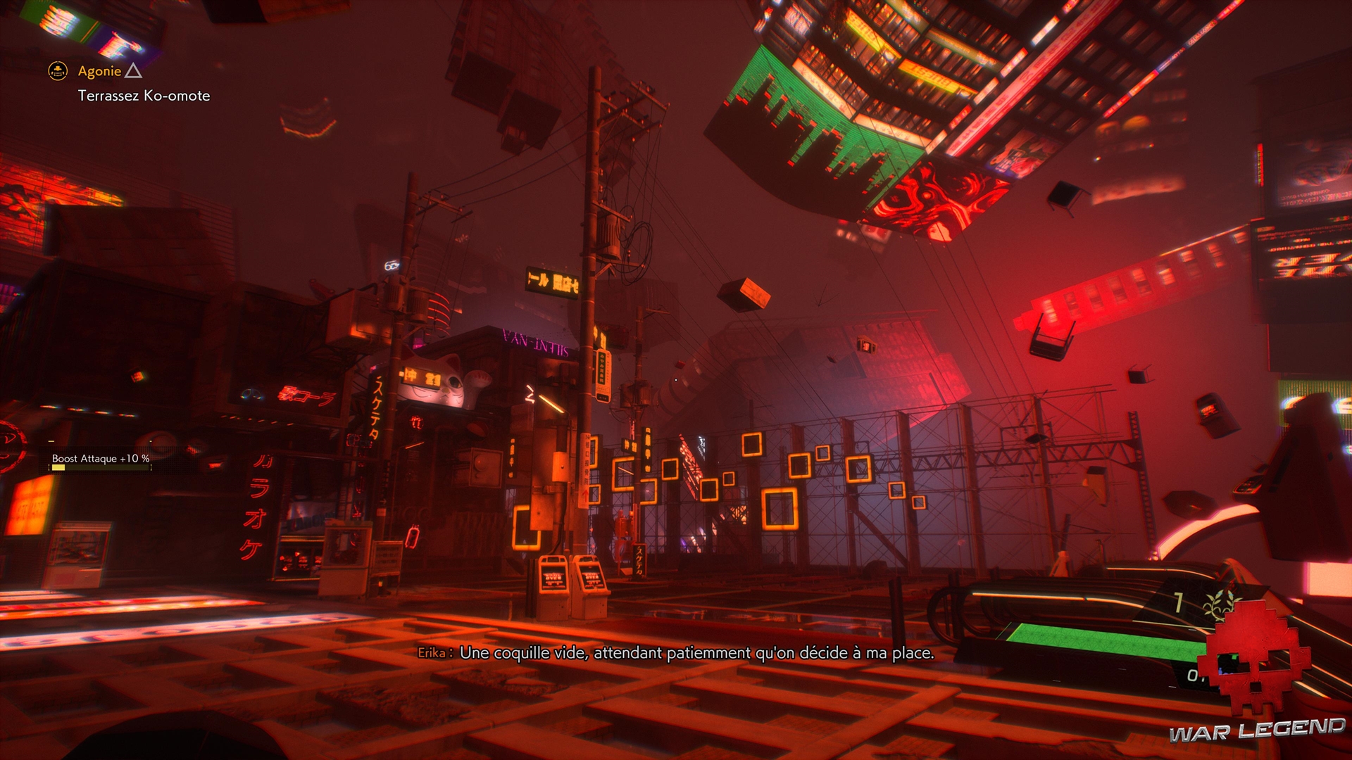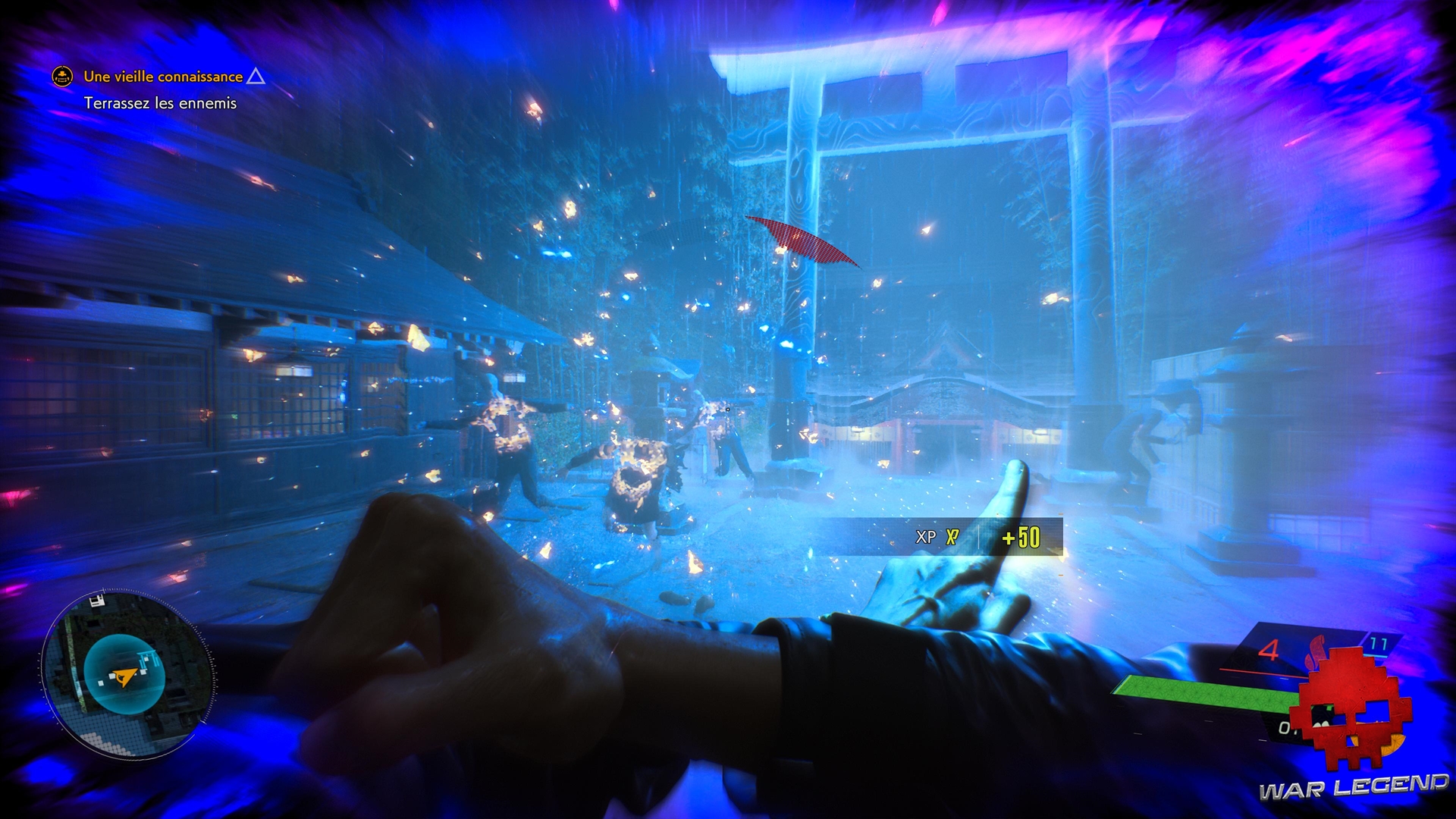 Mais ce moment d’apogée – assez difficile à encapsuler – ne dure qu’un temps car, comme dans tous les open-worlds de ces dernières années, l’incontournable arbre des compétences vient faire sa tambouille pour diluer un gameplay qui avait pourtant beaucoup de potentiel : les combats poussifs deviennent jouissifs, avant d’être rapidement rébarbatifs et sans challenge (notamment à cause d’un manque de variété chez les ennemies). Akito devient toujours plus puissant, mais les Visiteurs ne suivent pas la cadence, et les modificateurs de gameplay apportées par l’évolution du personnage finissent par tuer le plaisir de jeu.