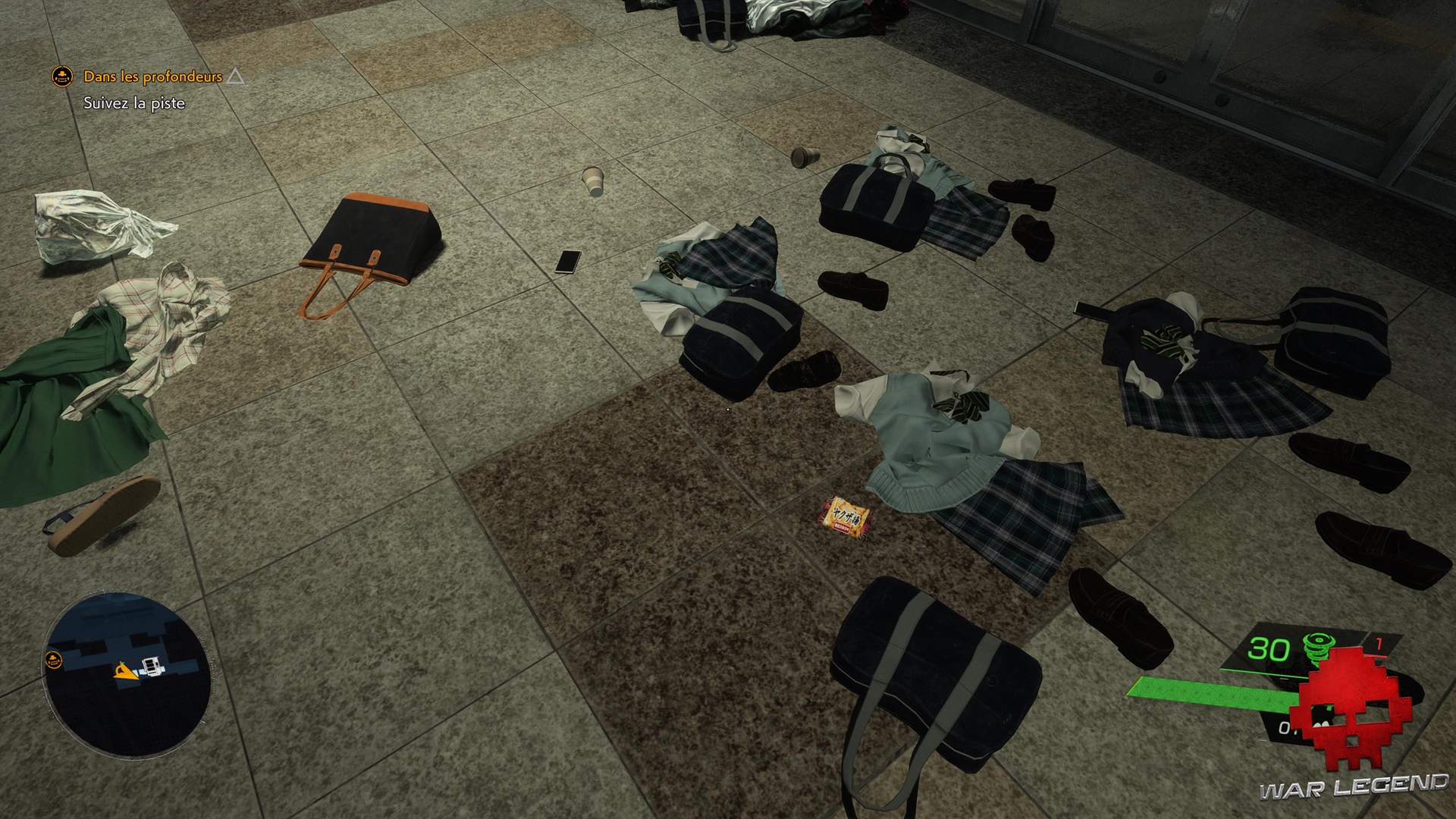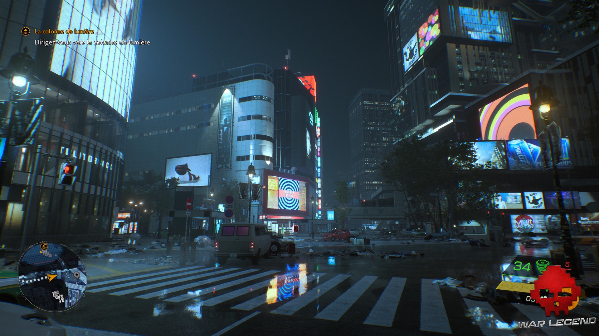 En déambulant dans les rues vides de Shibuya, levant les yeux au ciel pour apercevoir les énormes panneaux publicitaires qui continuent de vouloir vendre des produits à des personnes qui n’existent plus, on est happé par l’ambiance ésotérique du titre, les opportunités de narration environnementales étant particulièrement légions grâce aux nombreux vêtements laissés sur le sol et les voitures crachés, mettant l’accent sur le fait que le phénomène a été très soudain.