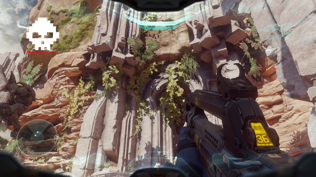 Ah bah non, c’est bien de l’aliasing. C’est quand même un peu décevant pour la figure de proue de la Xbox One de se retrouver avec un défaut pareil. Quand on regarde des paysages, on voit parfois – bien qu’il me faut bien l’admettre, rarement – de petites « dents » qui chatouillent l’œil juste ce qu’il faut pour se dire que c’est pas très classe, là où des jeux comme Rise of the Tomb Raider, qui sera testé prochainement dans nos colonnes, sont irréprochables. C’est d’autant plus décevant que Crystal Dynamics a développé le nouveau Tomb Raider pour plusieurs supports alors que Halo 5 n’est sorti (et, n’en déplaise, ça restera le cas) que sur Xbox One… On attendait donc une expertise au moins aussi grande. Même chose pour les ennemis en mouvement un peu au loin: c’est un problème récurrent et pas que dans le dernier opus, ils ont tendance à se mouvoir en saccades… Je précise toutefois que cet aliasing n’est pas présent partout, très loin de là. Il apparaît simplement dans quelques scènes mais ça m’a personnellement embêté dans un jeu, à la base, aussi beau, dans lequel j’adore profiter des paysages majestueux.