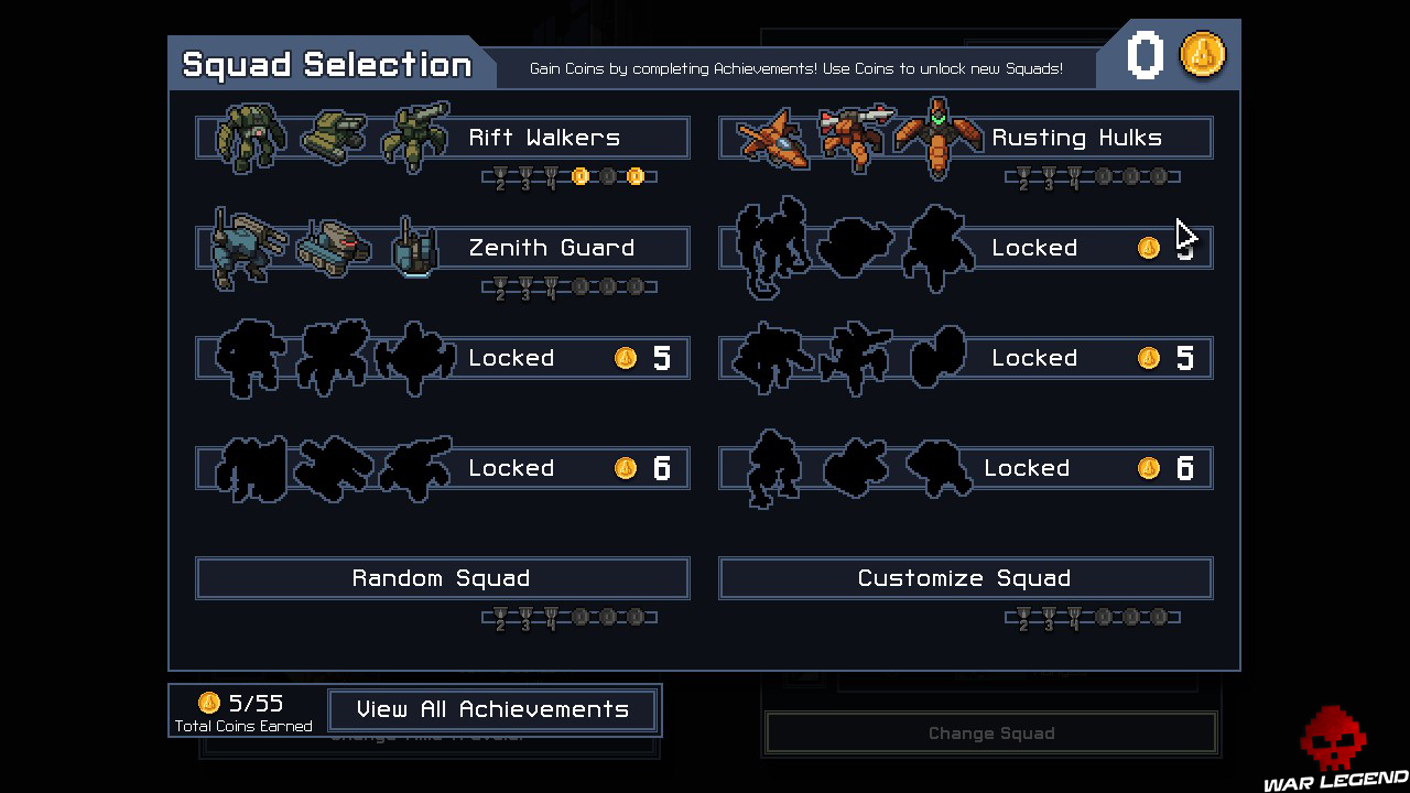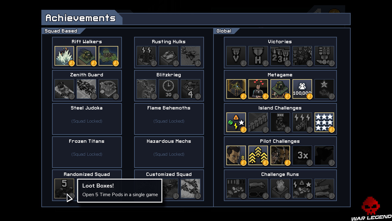 Pour progresser de manière encore plus générale en débloquant de nouvelles escouades de Mechs, comme pour FTL, vous devrez accomplir différents succès spécifiques. Si les premiers défis sont assez simples, le tout se corse assez rapidement et finir le jeu à 100% aura raison de vos méninges plus d’une fois. Accomplir la mission finale pour la première fois est un grand accomplissement en soi, et le joueur moyen peut tout à fait s’en contenter. Seulement, même après la première run réussie avec de nombreuses tentatives, le mode difficile vous attend alors. Comme dans FTL, la notion de personnalisation du challenge est également présente grâce à la possibilité de tenter d’accomplir la mission finale sans être obligé de sécuriser les quatre îles ou via la possibilité d’activer un chronomètre pour les speedrunners acharnés.