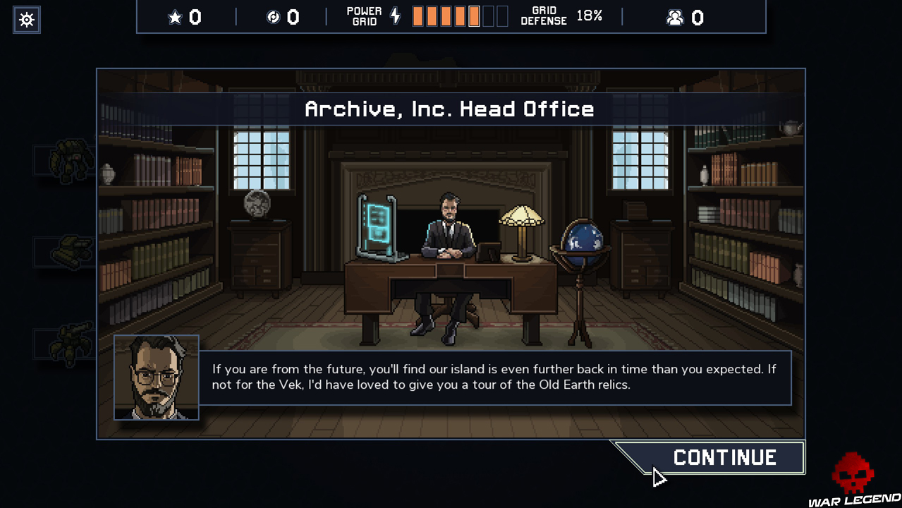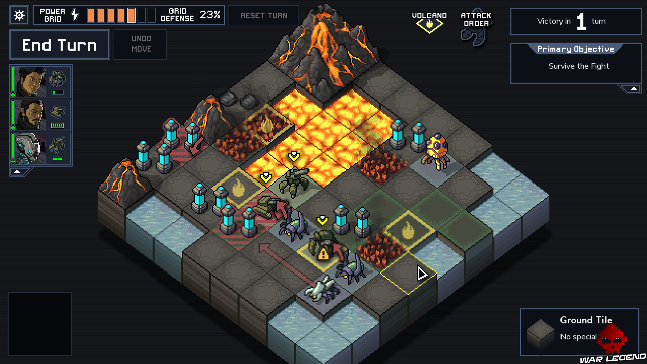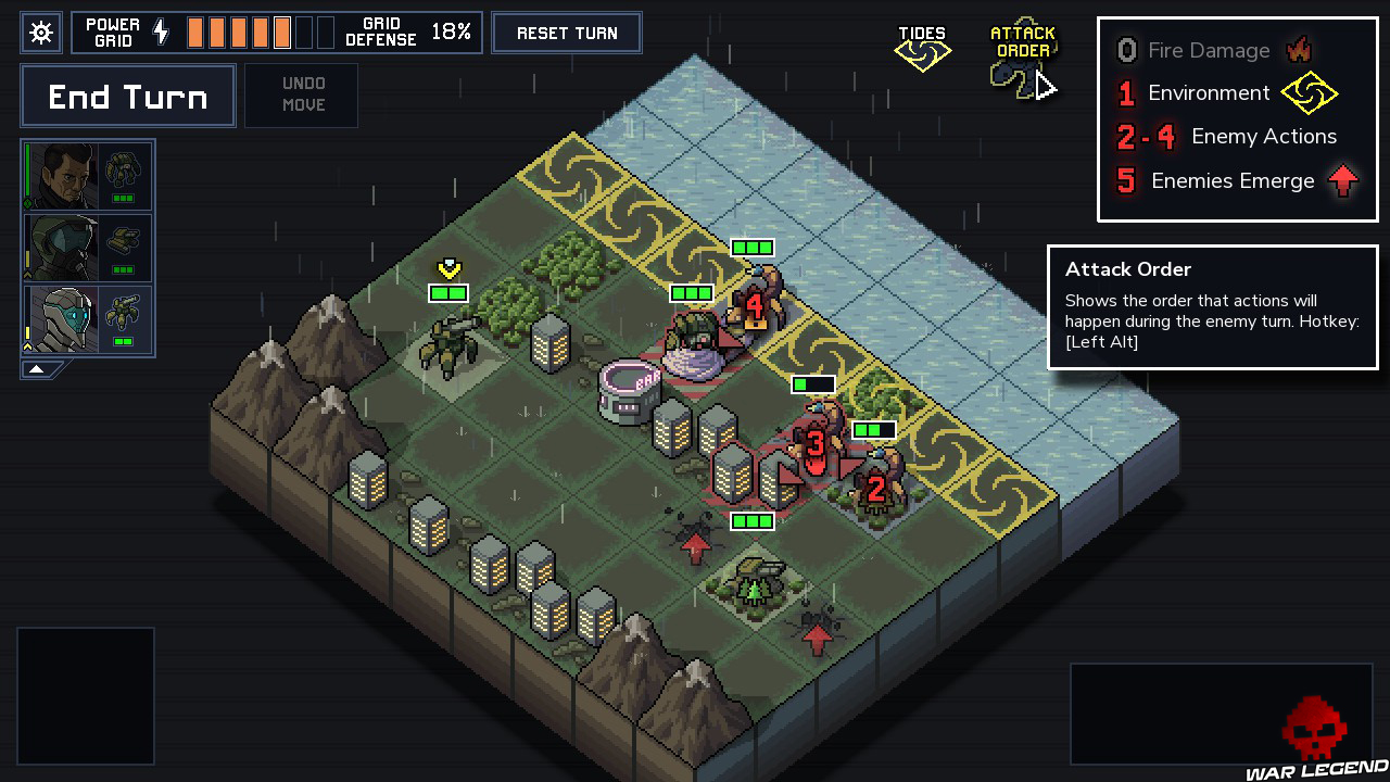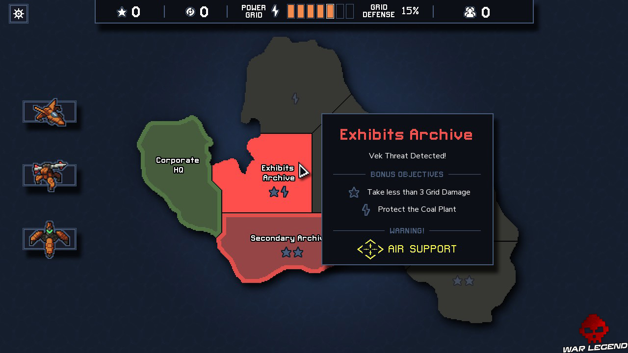 Vous possédez un simili de barre de vie qui vous suit pendant toute la campagne et si elle tombe à zéro, vous recommencez tout. Cette barre de vie représente l’énergie restant dans le GRID. À chaque fois qu’un bâtiment civil s’effondre à cause d’une attaque de Vek irrésoluble (ou le plus souvent, mal jugée), le GRID baisse. La vie de vos Mechs en revanche, remonte entre chaque mission, et il ne faudra pas hésiter à prendre des coups à la place des civils pour faire bonne figure.