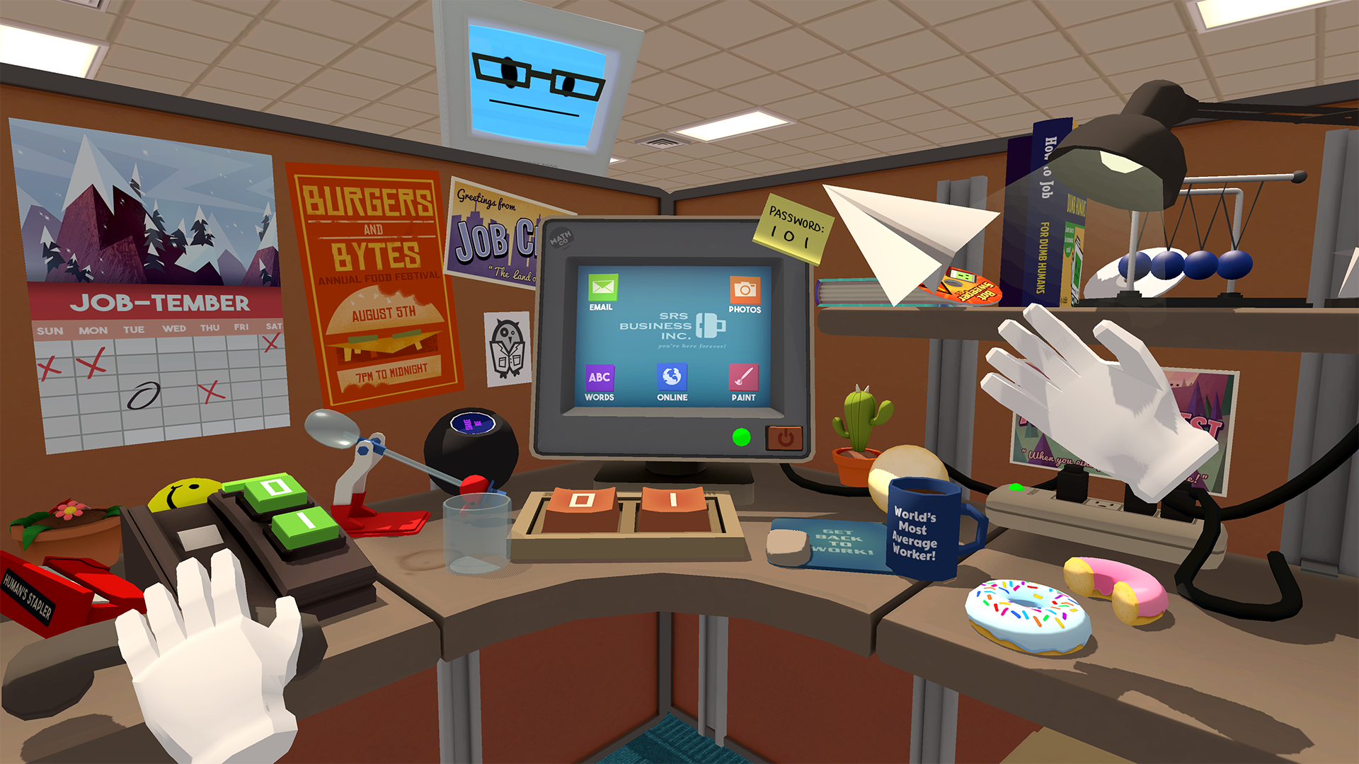Le jeu se résume à suivre des tâches simples avec un petit contexte rigolo lié à votre emploi actuel. Par exemple, saviez-vous que les employés de bureau commençaient toujours leur journée de travail avec un assortiment de donuts et un grand café ? Tout est instinctif et logique : prenez un donut et portez-le à votre bouche virtuelle, prenez un mug et placez la dans la machine à café puis appuyez sur le bouton. Les tâches se complexifient ensuite (mais pas trop). Par exemple, vous avez besoin d’envoyer un mail, mais l’ordinateur n’est pas alimenté. Vous cherchez les prises électriques, les branchez au secteur en manipulant les câbles, vous vous penchez sur l’ordinateur et appuyez sur le bouton Power avant de vous rendre compte que l’écran n’est pas allumé. Ça a l’air très con expliqué comme ça, mais l’environnement VR transforme le fait qu’une simple tâche triviale rend le jeu très organique et vraisemblable.