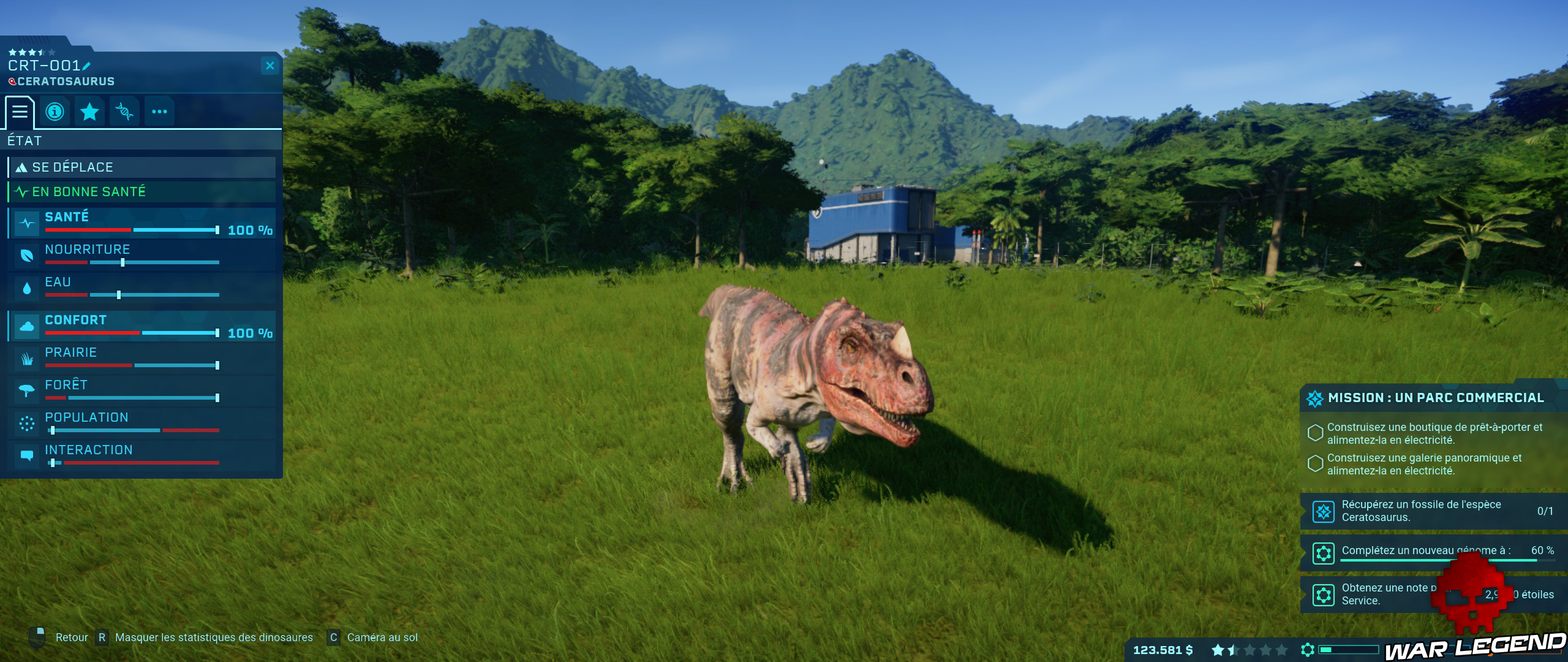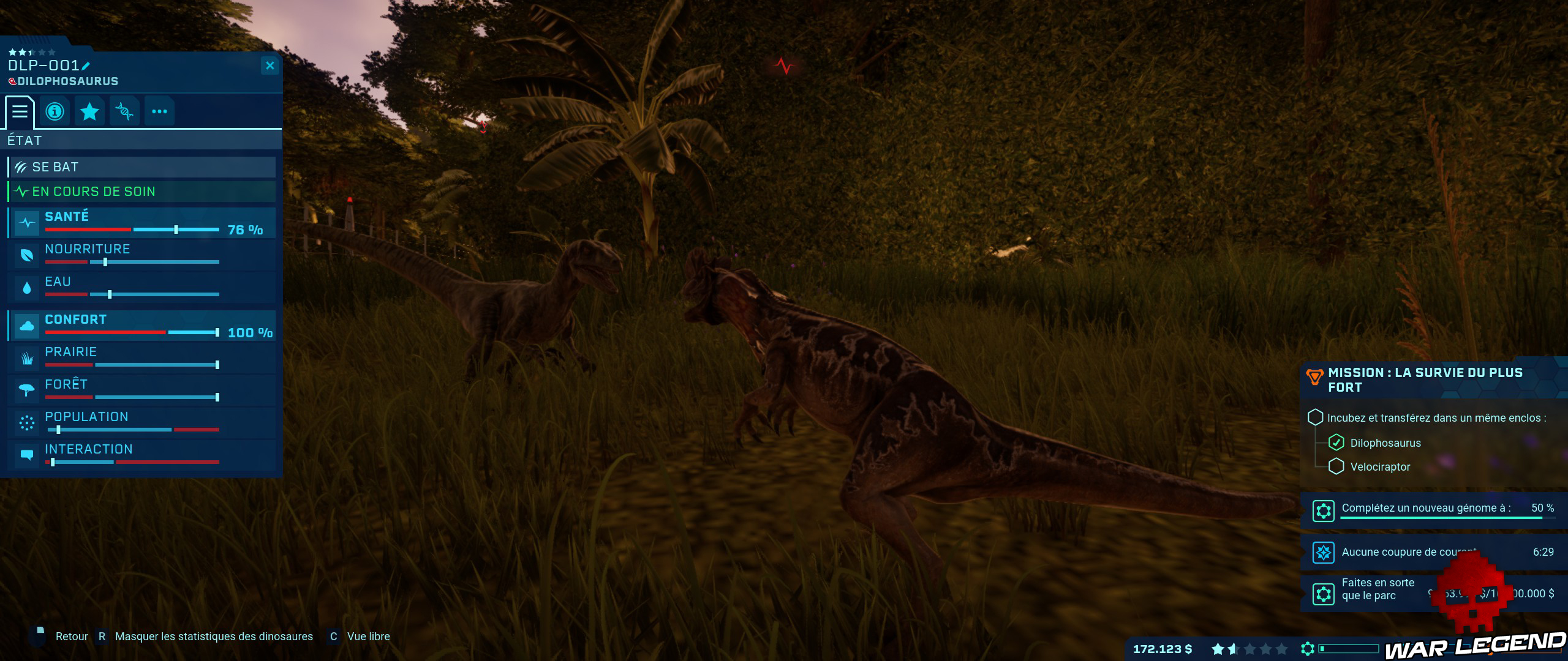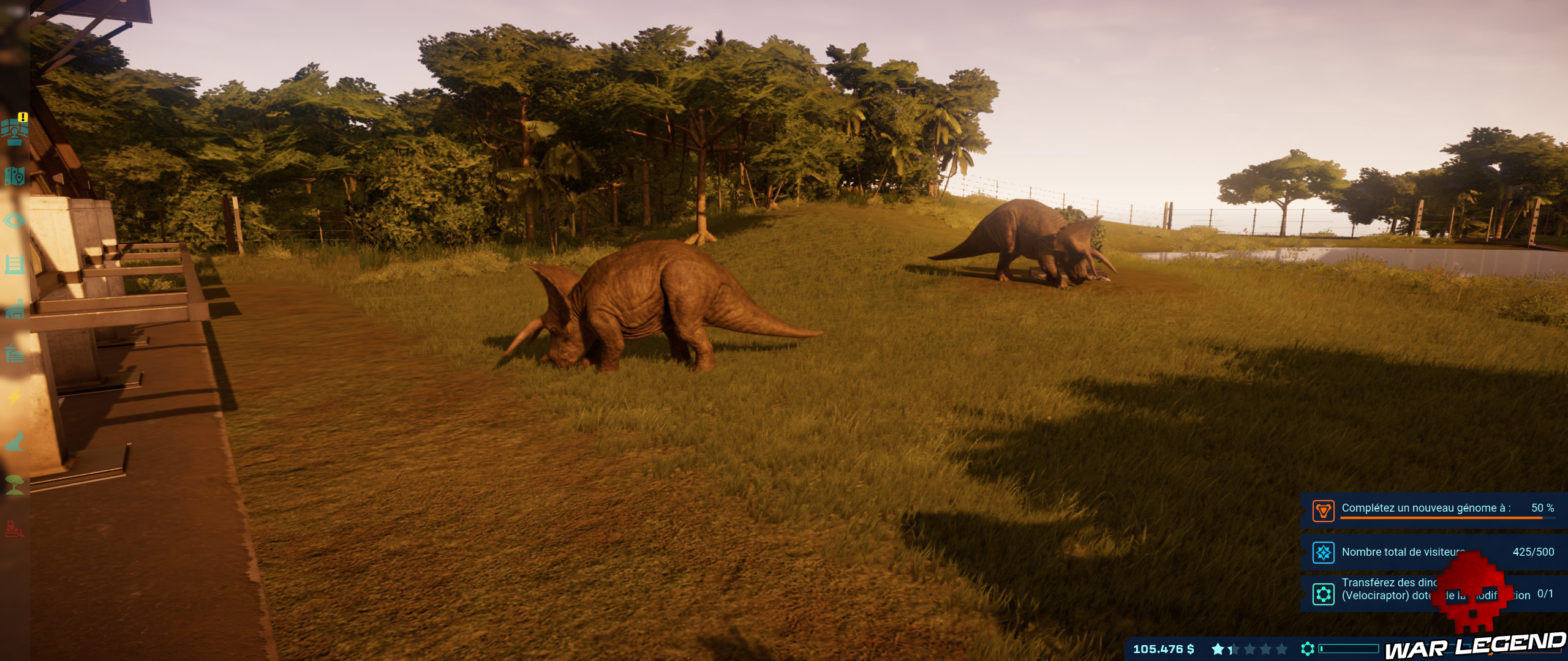 Il vous appartiendra donc de rechercher des remèdes pour les maladies qui auront tôt fait de se répandre si vous ne faites rien. D’autre part, les indicateurs de confort des dinosaures n’offrent pas que des seuils mais aussi des plafonds. Par exemple, un tricératops ne tolère qu’un nombre donné d’autres dinosaures dans son enclos, mais il lui en fait tout de même un minimum. Si vous ne satisfaites pas suffisamment de conditions de confort, vos précieux (parce qu’ils coûtent quand même une blinde) spécimens pourraient bien avoir envie de se faire la malle et il n’hésiteront pas à entamer les clôtures.