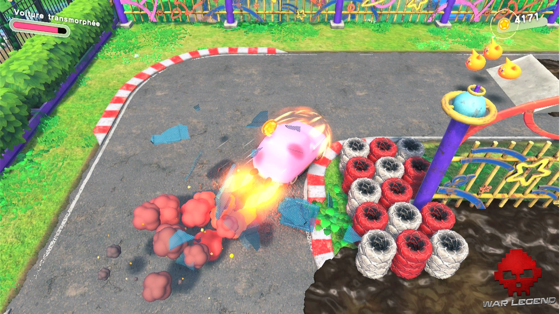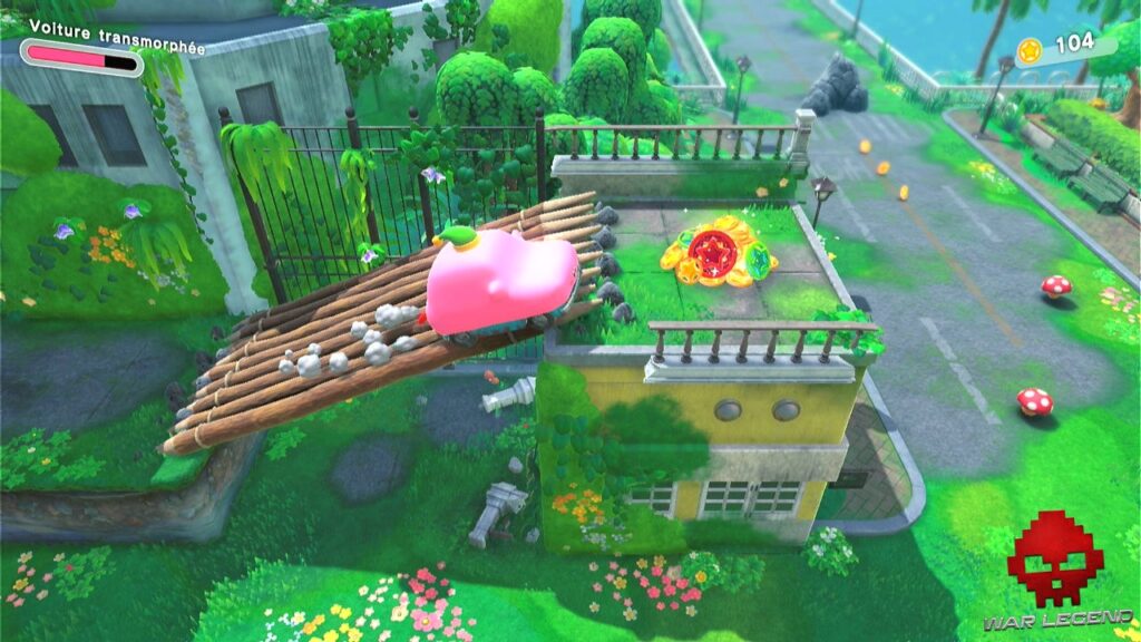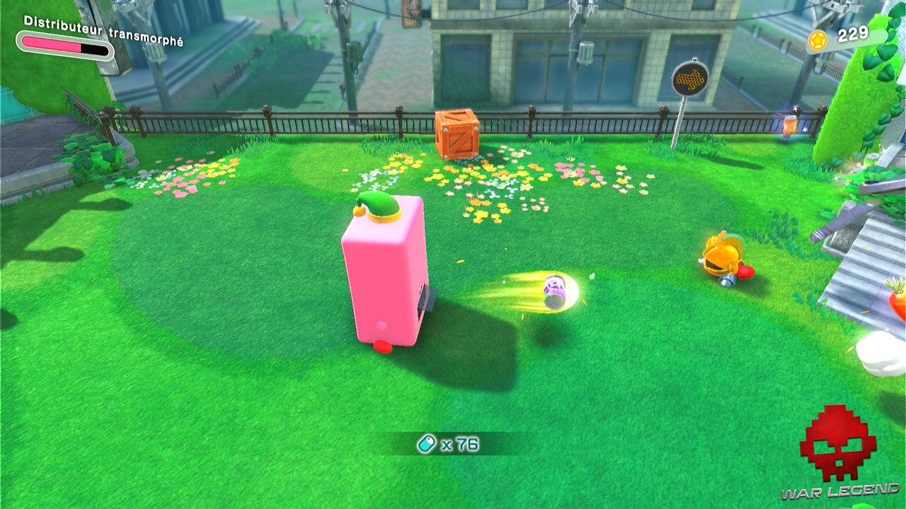 Quand Kirby avale un distributeur, il se transforme en véritable minigun à canettes, tandis que la fameuse voiture permet d’arpenter le parcours à toute berzingue. Cela permet souvent d’ouvrir simplement la voie, ou d’offrir des phases de jeu complètement uniques, comme