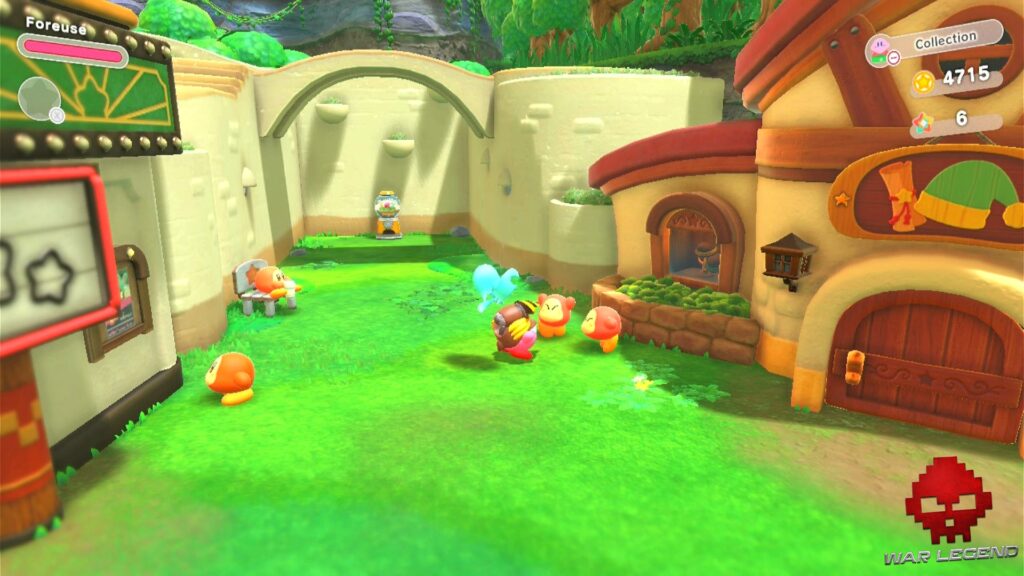 Que les complètionnistes se rassurent également, ils auront à boire et à manger, notamment via des capsules de gacha à trouver dans les niveaux, ou bien en dépensant toute sa thune de façon irresponsable dans des distributeurs au village des Waddle Dees. Kirby incarne toujours aussi bien ce symbole de l’insouciance (à moins que cela soit un moyen de soutenir financièrement la reconstruction du village après la razzia du Beast Pack).