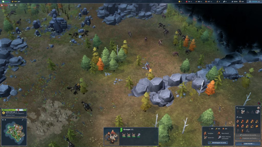 Le jeu est simple à comprendre, mais difficile à maîtriser. Le début de la partie est clairement le moment le plus important. Une cabane d’éclaireur vous servira à explorer les alentours et à repérer les territoires les plus intéressants à coloniser. Certaines zones comportent des cerfs et des terres fertiles qui vous permettront d’accroître votre production de nourriture. D’autres comportent des choses moins sympathiques comme des loups, des draugr, ou des kobolds, avec qui il est possible de commercer (juste les kobolds, pas les loups évidemment).