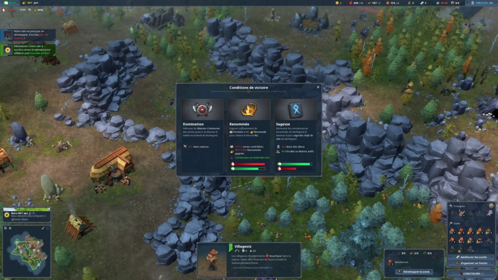 Northgard se prend en main très rapidement, à défaut d’être un jeu facile. En partant de 4 crasseux et un chef de clan, vos objectifs seront (très) longs à atteindre et vont vous demander une attention de tous les instants. Dans Northgard, le bois sert à construire et à se chauffer, tandis que la nourriture sert… à nourrir, et également à coloniser les territoires voisins.