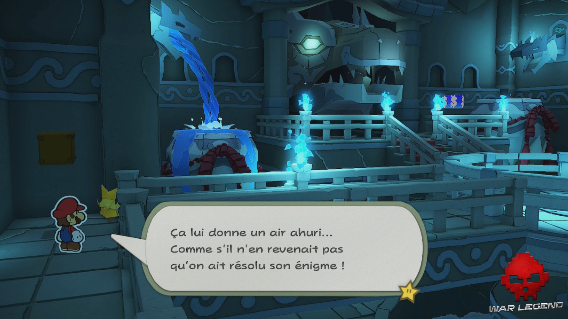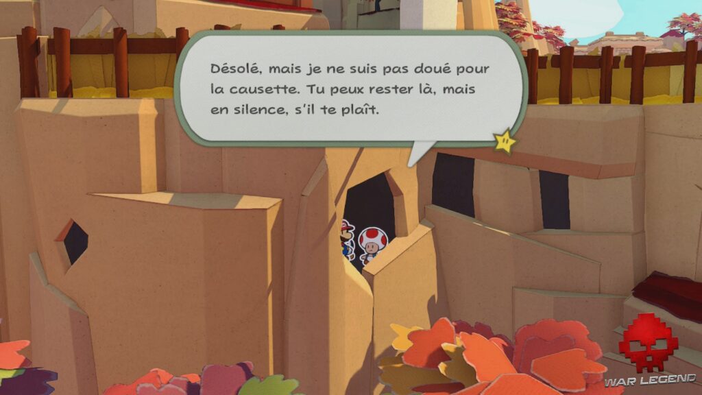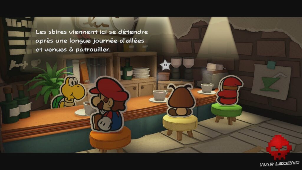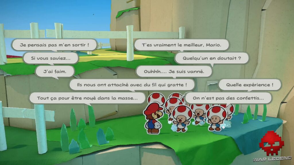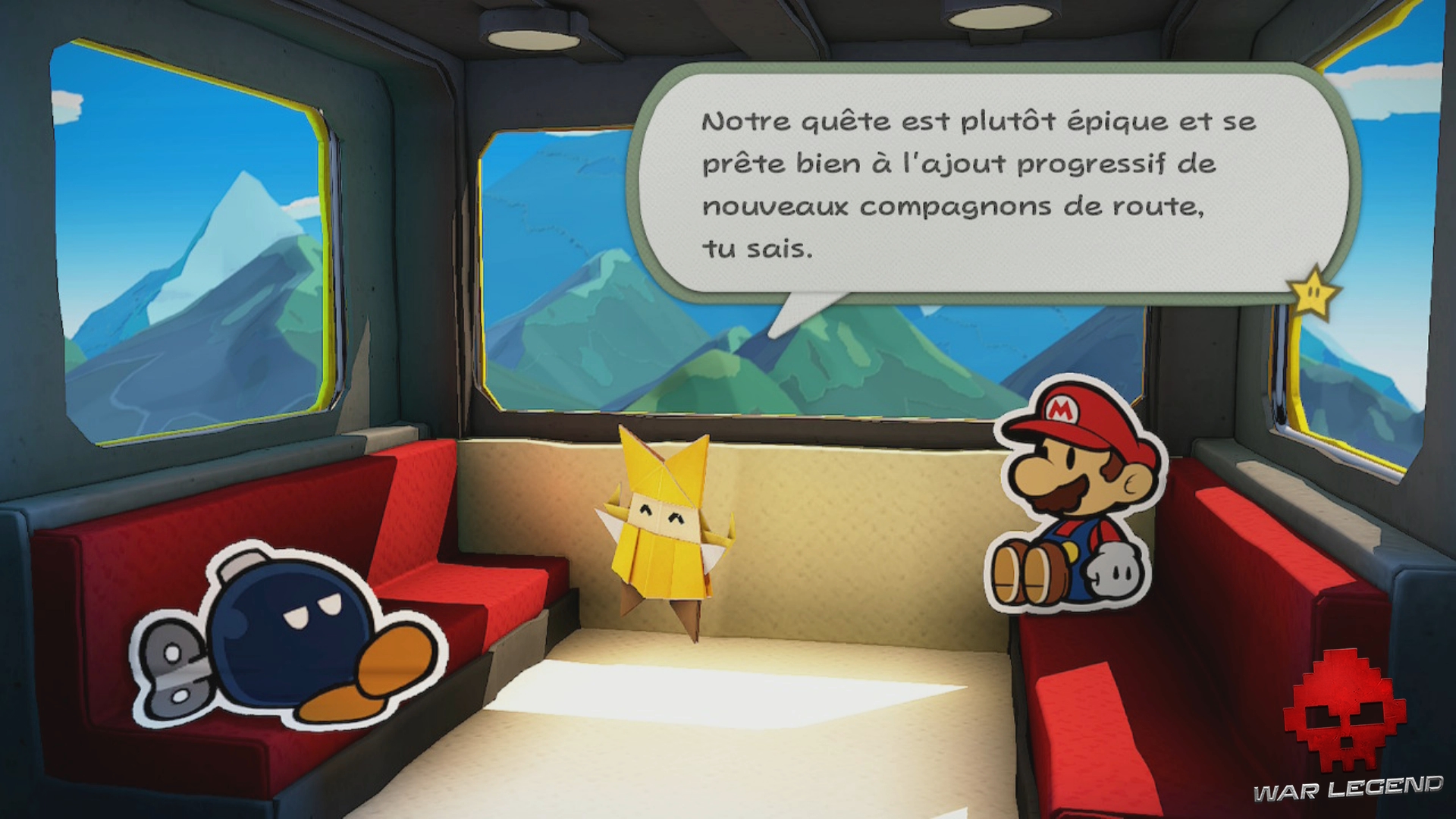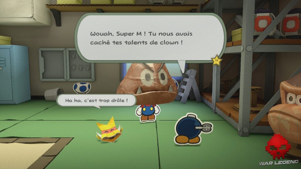 Vous l’aurez remarqué aux calembours (pitoyables) de ce test, l’écriture et la localisation française sont vraiment bonnes, avec des champs lexicaux sur le pliage et le rayon papeterie à se plier de rire, soutenus pas une mise en scène généreuse, intelligente et efficace. Qui m’aurait dit un jour qu’un Bob-omb serait le meilleur compagnon que j’ai jamais eu depuis Mass Effect ? Certes, l’écriture reste candide et bon enfant, mais il y a vraiment des petites fulgurances d’écriture qui savent arracher un rire, voire un sentiment de tendresse, notamment grâce au compagnon de Mario : Olivia. C’est vraiment bien.