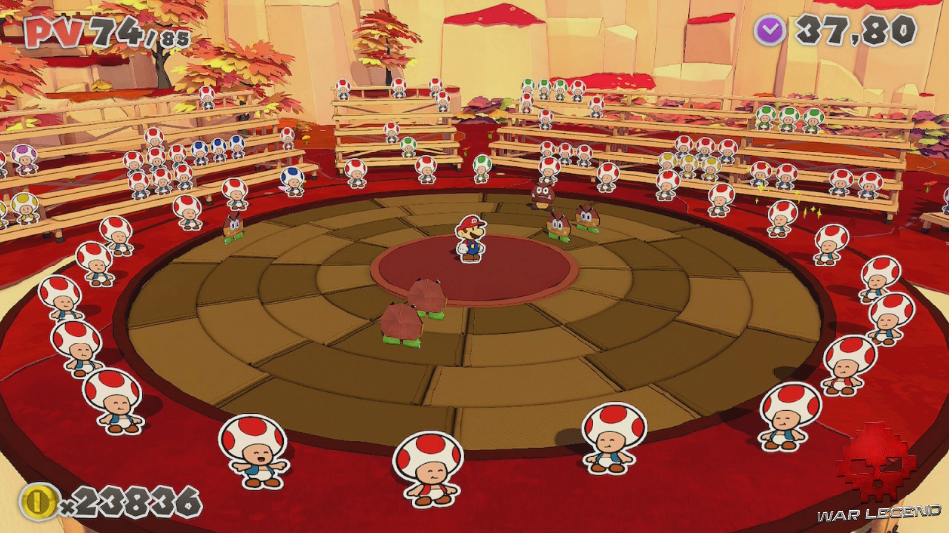 Premier constat, ce nouveau Paper Mario n’est plus vraiment un RPG : plus de barre d’expérience, plus d’arbres de talent… le strict minimum étant l’inventaire avec différents objets de combats par niveau et quelques points de vie max récupérés au fil de l’aventure en tant que simples objets trouvés.