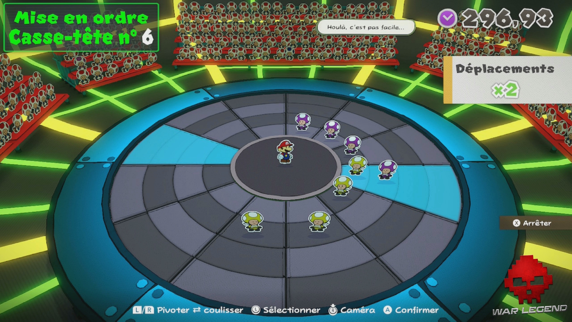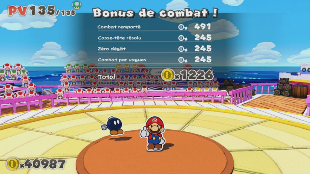 Et ne pas résoudre la solution d’un combat est juste frustrant, une perte de temps qui oblige à se farcir des ennemis alors éparpillés. On peut acheter du temps avec des pièces (qu’on ne manque jamais vraiment), mais j’avais demandé de jouer à Paper Mario, pas Picross (et j’adore Picross, hein ?). D’autant plus que la plupart des puzzles de combat sont assez faciles une fois qu’on a pris le pli, et la difficulté ne décolle jamais vraiment. Et ne pas plier le combat à cause d’un simple QTE ratée, laissant le malheureux Maskass à 1 PV, c’est rageant puissance 1000.