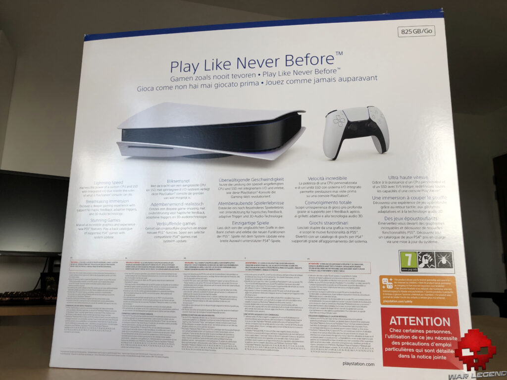 À l’ouverture, nous tombons sur les habituels câbles et autres livrets d’informations, mais aussi la fameuse DualSense censée apporter des sensations inédites au joueur. Sous ce premier carton est nichée le PS5, qui se révèle enfin dans toute son imposante splendeur.
