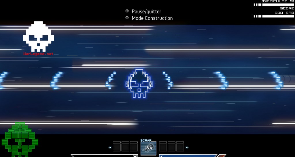 Toujours au sujet de la difficulté, il faut bien reconnaître que l’ensemble manque un peu de dosage. Autant je suis le premier à aimer me prendre des dérouillées virtuelles, autant ici le niveau se corse tout de même très rapidement et on se retrouve vite à devoir choisir entre des missions difficiles et très difficiles. Bien sûr, plusieurs parties échouées vous conduisent à revoir votre stratégie dans la création de votre vaisseau et ça vous permet au fur et à mesure d’aller un peu plus loin, mais j’ai trouvé le changement un peu trop abrupt. Un défaut, s’il en est, mineur et au final en concordance avec cette idée de rogue-like. Cependant, on pourra reprocher aux boss leurs mouvements. C’est un peu comme s’ils s’étaient réunis pour signer un accord selon lequel ils doivent tous bouger selon les mêmes mouvements en combat. Il y aura quelques variations, mais au final on reste globalement dans le même délire. Toutefois, n’allez pas croire que ça simplifie les choses pour autant puisque plus le grand méchant s’en prend dans la tronche, plus il rage (un peu comme vous devant l’écran) et plus il effectue ses déplacements vite. Vous aurez donc besoin de toute votre concentration pour qu’il ne vous coince pas dans un coin et vous moleste allègrement.