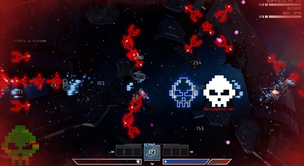 Dernier semi-défaut pour moi : les textes. Comme vous avez pu le sentir dans le trailer, Psycho Starship Rampage joue aussi la carte de l’humour. Je suis d’accord pour dire que tout cela est subjectif, mais il est vrai que quitte à avoir des textes flottants, évocations de ce que disent les équipages adverses, j’aurais aimé que ça soit un peu plus rock’n’roll et tranchant. J’aurais aimé prendre plus de plaisir à lire ces textes plaintifs d’aliens hurlant à la mort en suppliant leur môman de venir à leur rescousse. En revanche, j’ai franchement apprécié trouver des références, de la part de l’IA de notre cher vaisseau, renvoyant directement à des monuments de la SF. Mention spéciale à Star Wars/La Guerre des Etoiles de George Lucas (« If you strike me down, I shall become more powerful than you can possibly imagine » – Obi-Wan Kenobi) et à Slaughterhouse Five or the Children’s Crusade/Abattoir 5 ou la Croisade des enfants de Kurt Vonnegut (« Everything was beautiful and nothing hurt »).