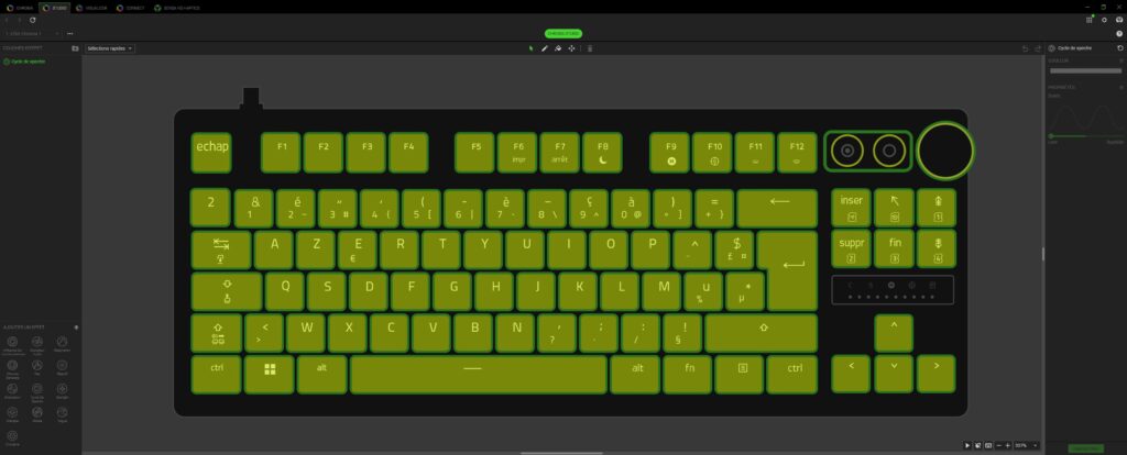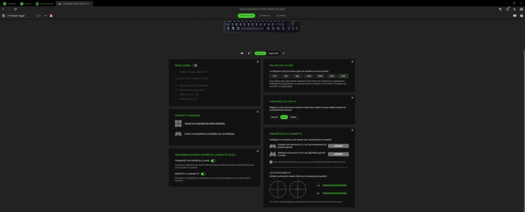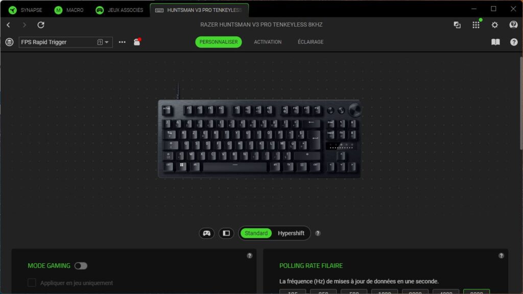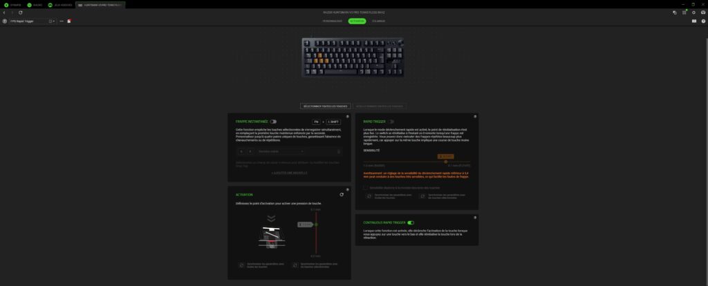 Qui dit périphérique Razer, dit Razer Synapse. Le logiciel est obligatoire pour débrider tout le potentiel du clavier. C’est une interface dense, parfois un peu lourde, mais extrêmement complète. C’s ici que l’on va régler finement le point d’activation de chaque touche, la sensibilité du Rapid Trigger, gérer les profils d’éclairage Chroma, et assigner des macros.