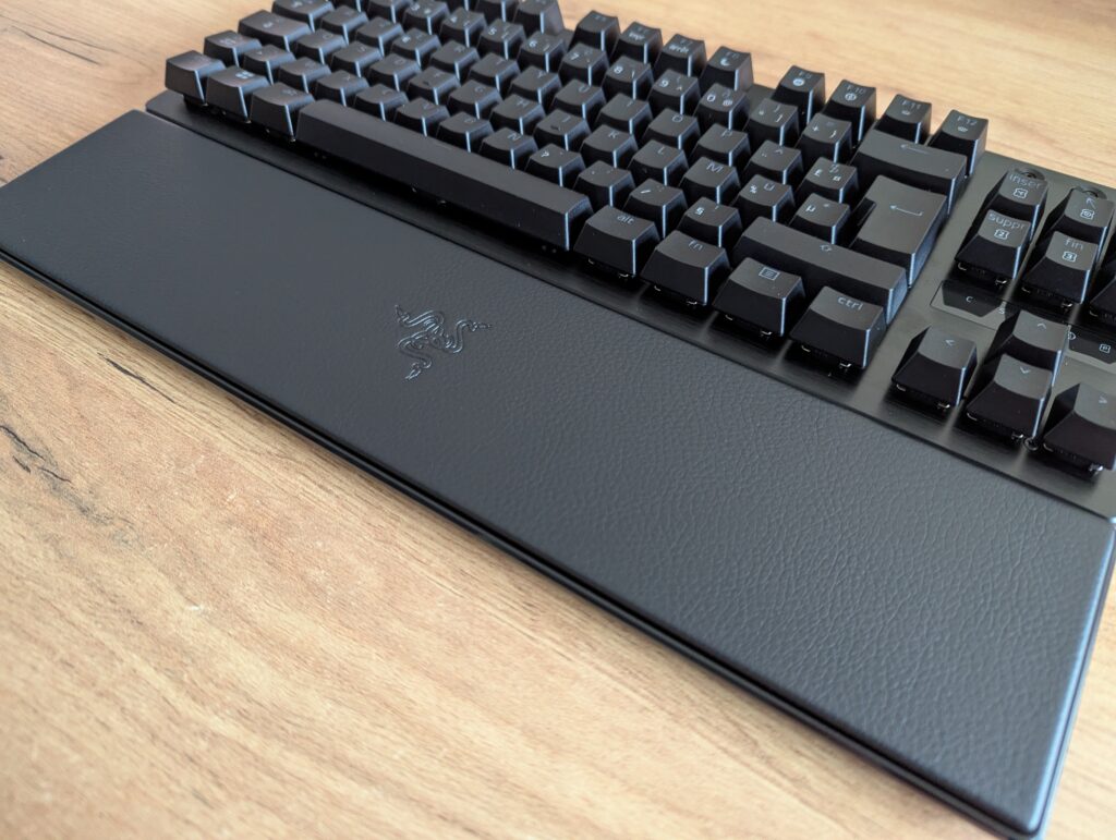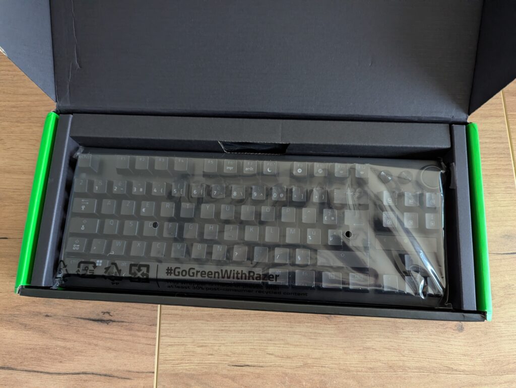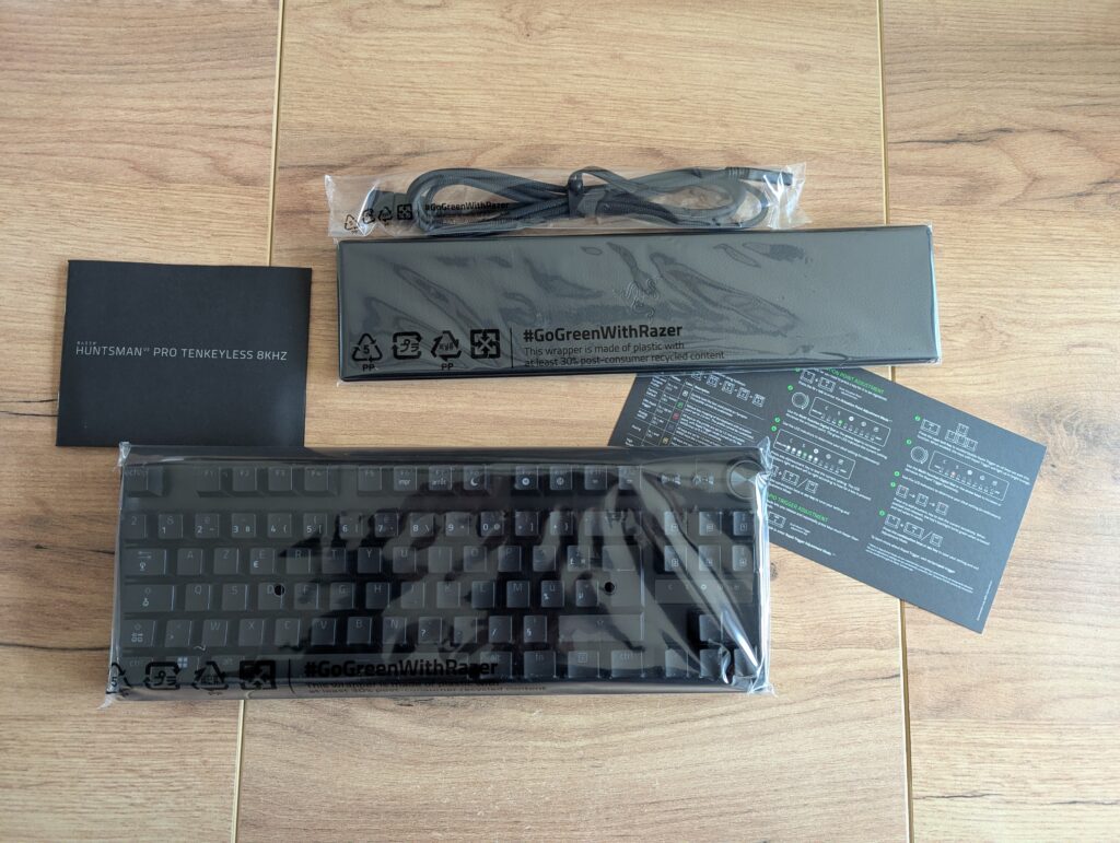 Le packaging du Razer Huntsman V3 Pro 8KHz reste dans les standards de Razer : sobre, efficace… et vert. À l’intérieur, on trouve le clavier, un câble USB-C vers USB-A tressé et détachable (un excellent point pour la durabilité et le transport), ainsi qu’un repose-poignets magnétique. Pas de fioritures, on va à l’essentiel. Dommage malgré tout de retrouver du plastique pour les emballage, matière dont la marque aux serpents à tendance à se débarrasser au profit du tissu.