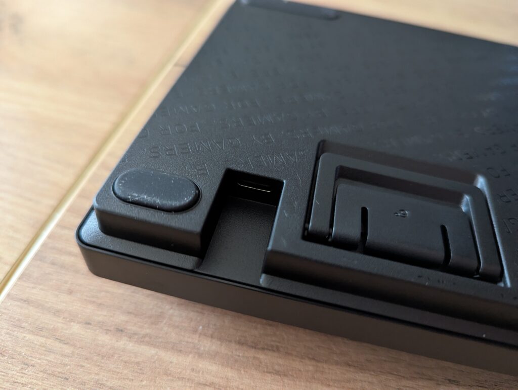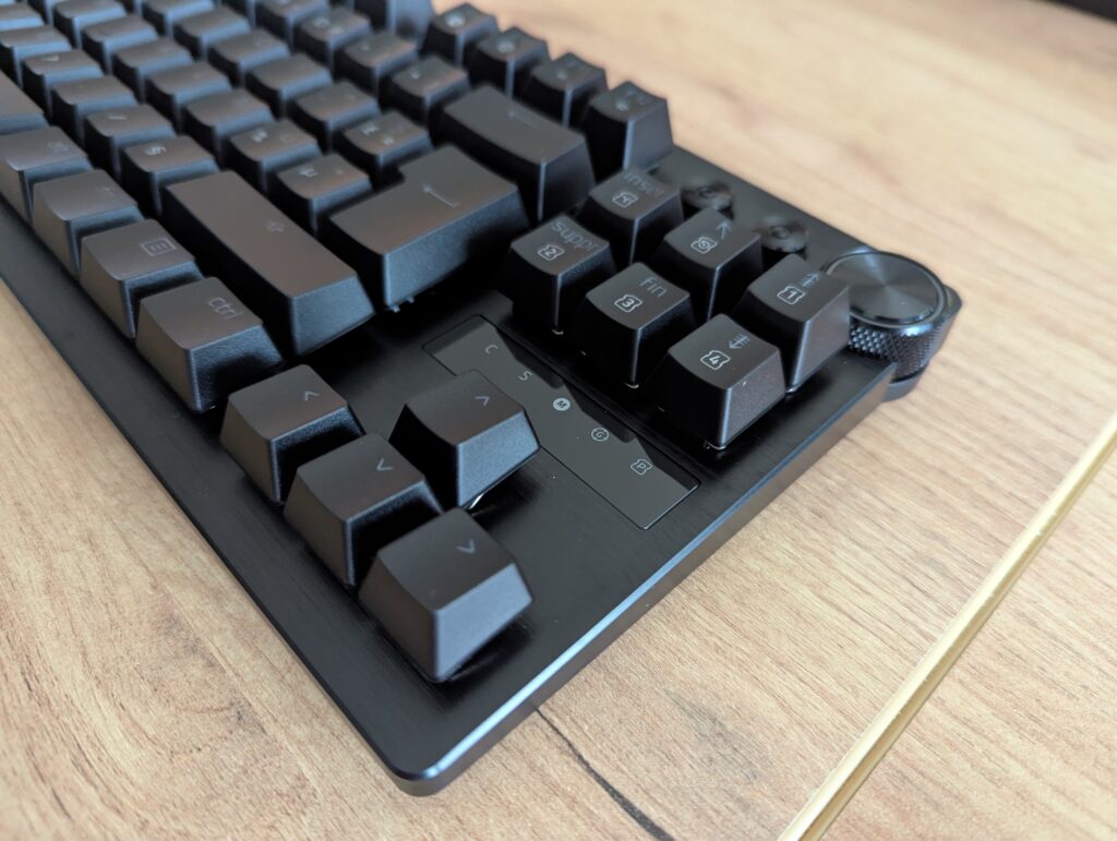 Côté boutons, on trouve trois touches média dédiées, juste au-dessus du pavé numérique. À leur droite se présente une molette numérique multifonction. Celle-ci est texturée et crantée, ce qui permet d’ajuster le son ou d’autres paramètres (comme la sensibilité des switchs) avec précision.