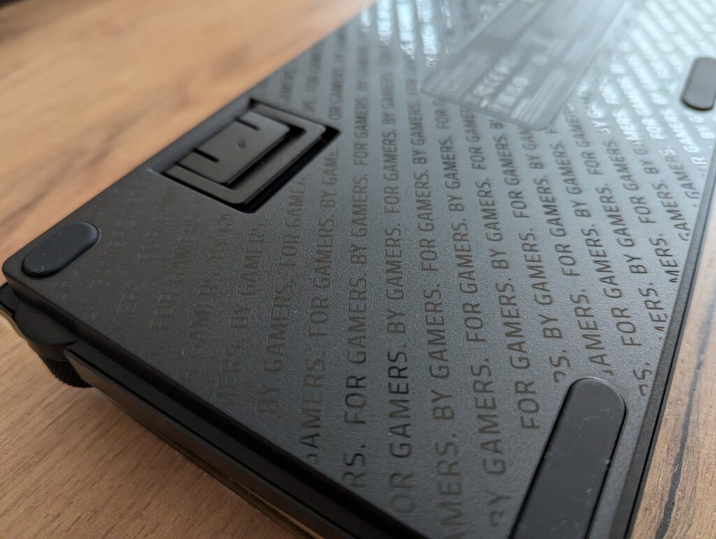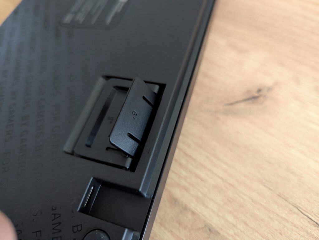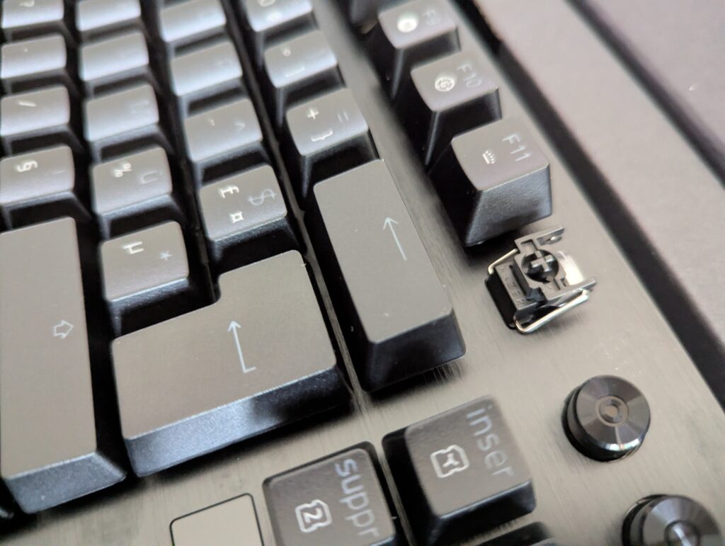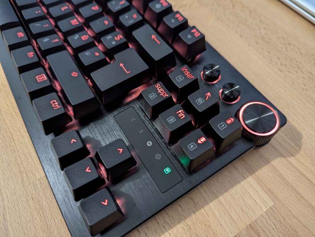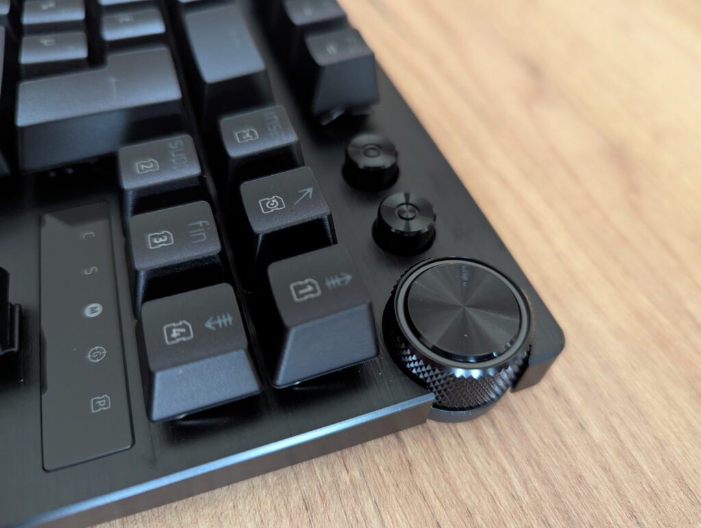 Le repose-poignets magnétique en similicuir est un ajout bienvenu, mais qui pourrait surprendre certains puisqu’il s’agit d’une plaque de plastique bien dure. Si vous aimez les petits nuages pour poser vos pognes, ce repose-poignets ne va clairement pas vous plaire. Enfin, on apprécie la présence de trois boutons multimédias dédiés et d’une molette numérique multifonction texturée, qui tombe parfaitement sous la main pour gérer le volume ou d’autres paramètres à la volée. Le design de cette molette est agréable à l’œil, d’autant qu’elle sort un peu du cadre du clavier. Une petite originalité qui m’a personnellement séduit.
