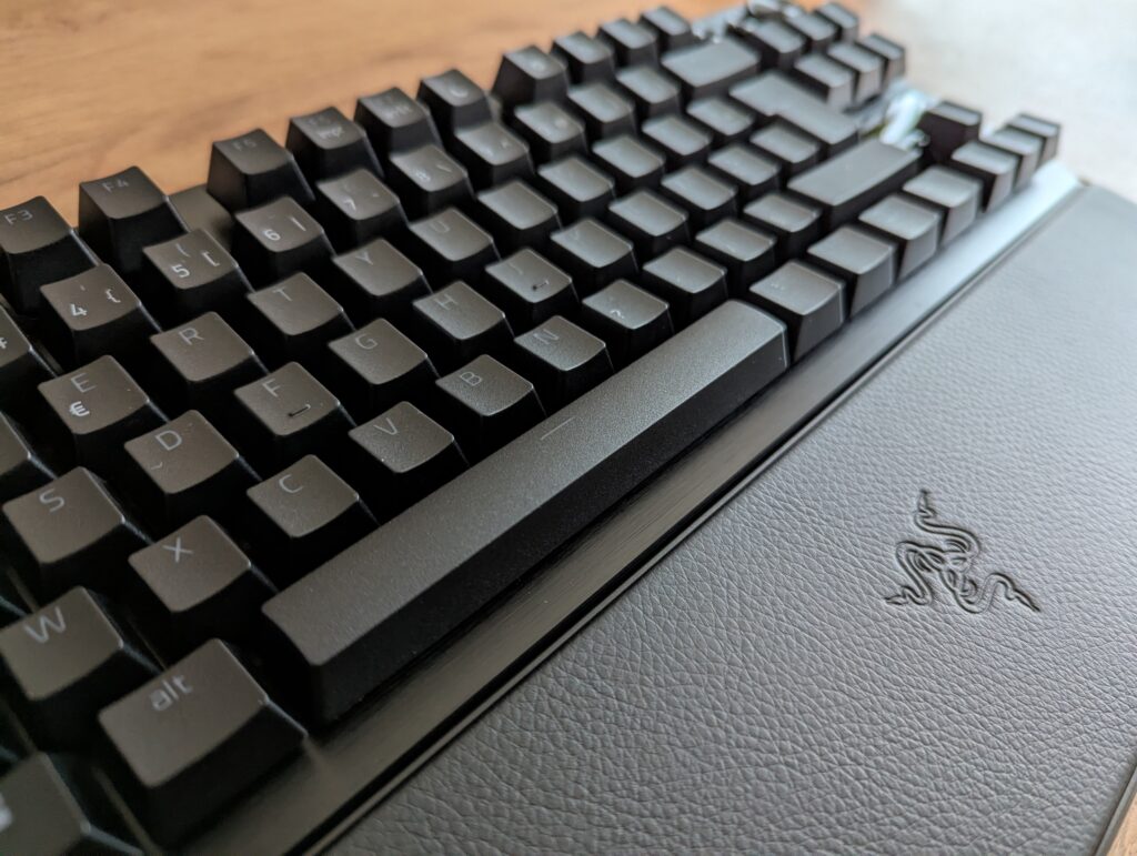 Le Huntsman V3 Pro 8KHz se présente avec une relative sobriété, si ce n’est l’éclairage Chroma RGB personnalisable. Une LED RGB (désactivable dans le logiciel propriétaire) éclaire chaque touche, et on retrouve un design épuré, sur une jolie robe noire mate.
