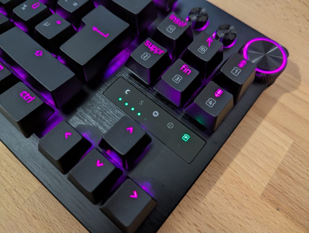 On notera que le clavier est livré avec une petite fiche récapitulative de ce qu’il peut vous proposer. Car le Razer Huntsman V3 Pro 8KHz permet des réglages bien pratiques à la volée, sans passer par Razer Synapse, à commencer par l’ajustement du point d’activation d’une touche ou celui du Rapid Trigger. Ainsi vous trouverez au-dessus des flèches directionnelles un petit écran affichant le point d’activation en question sur une petite réglette crantée. Très, très pratique.