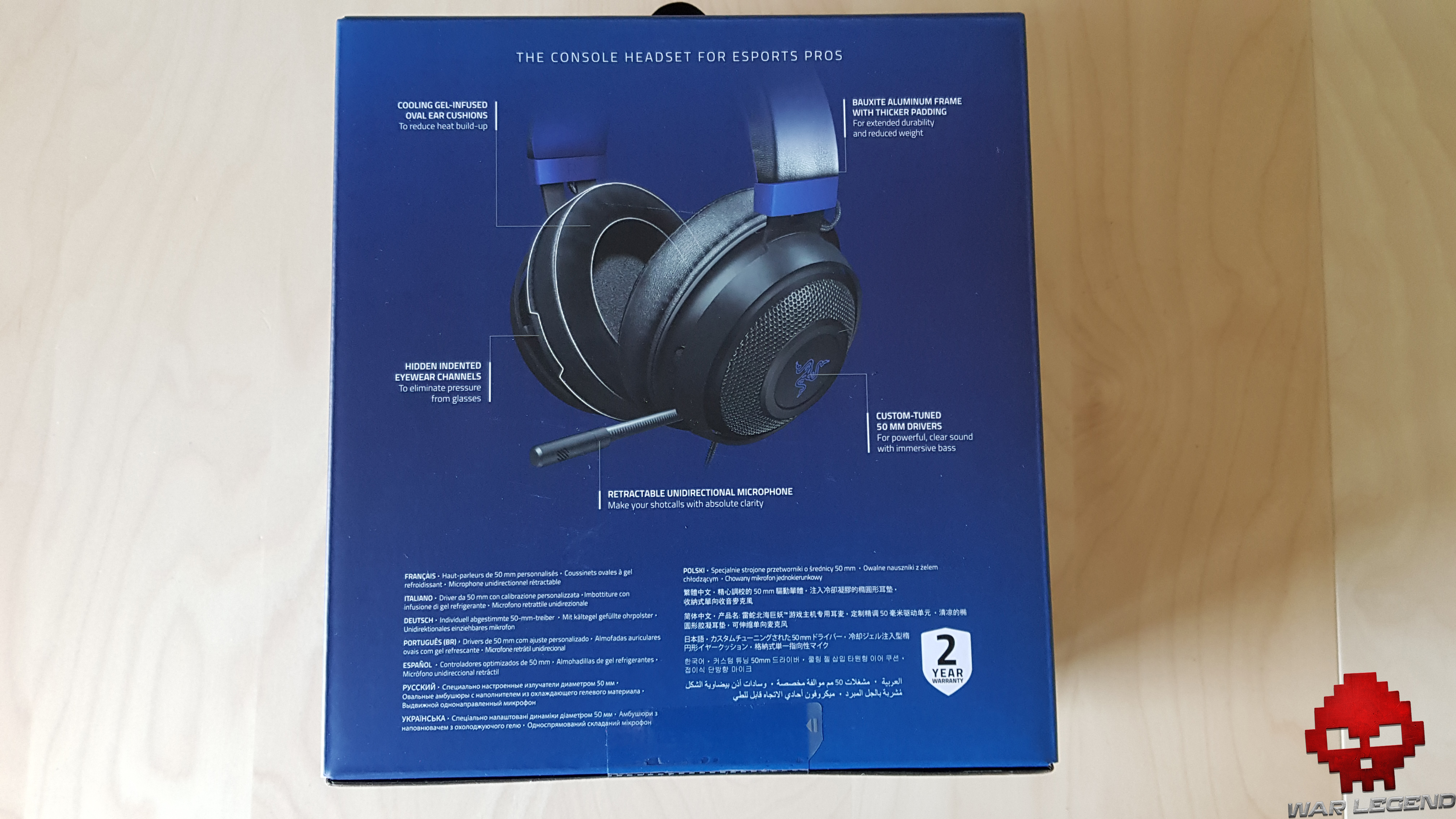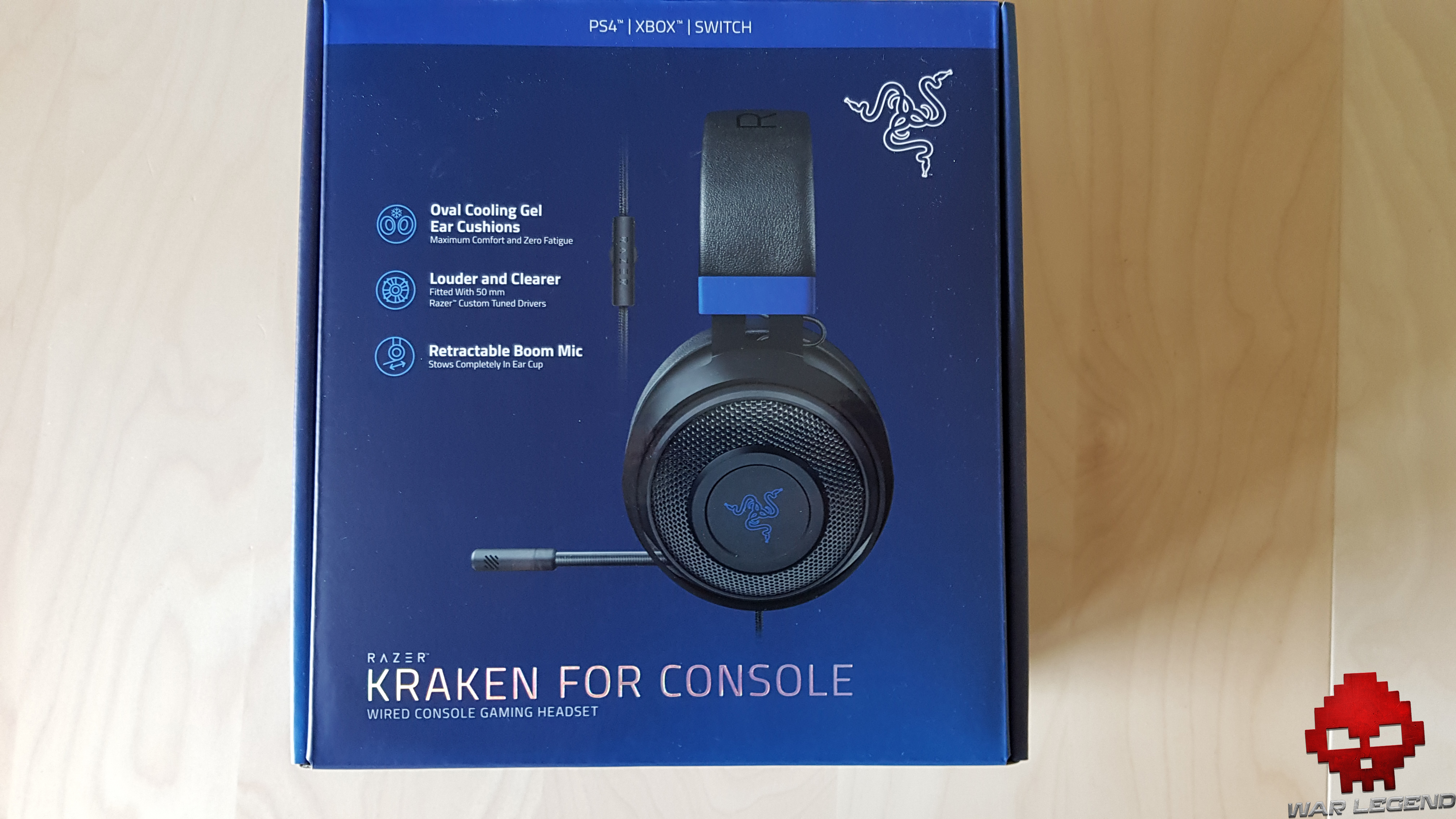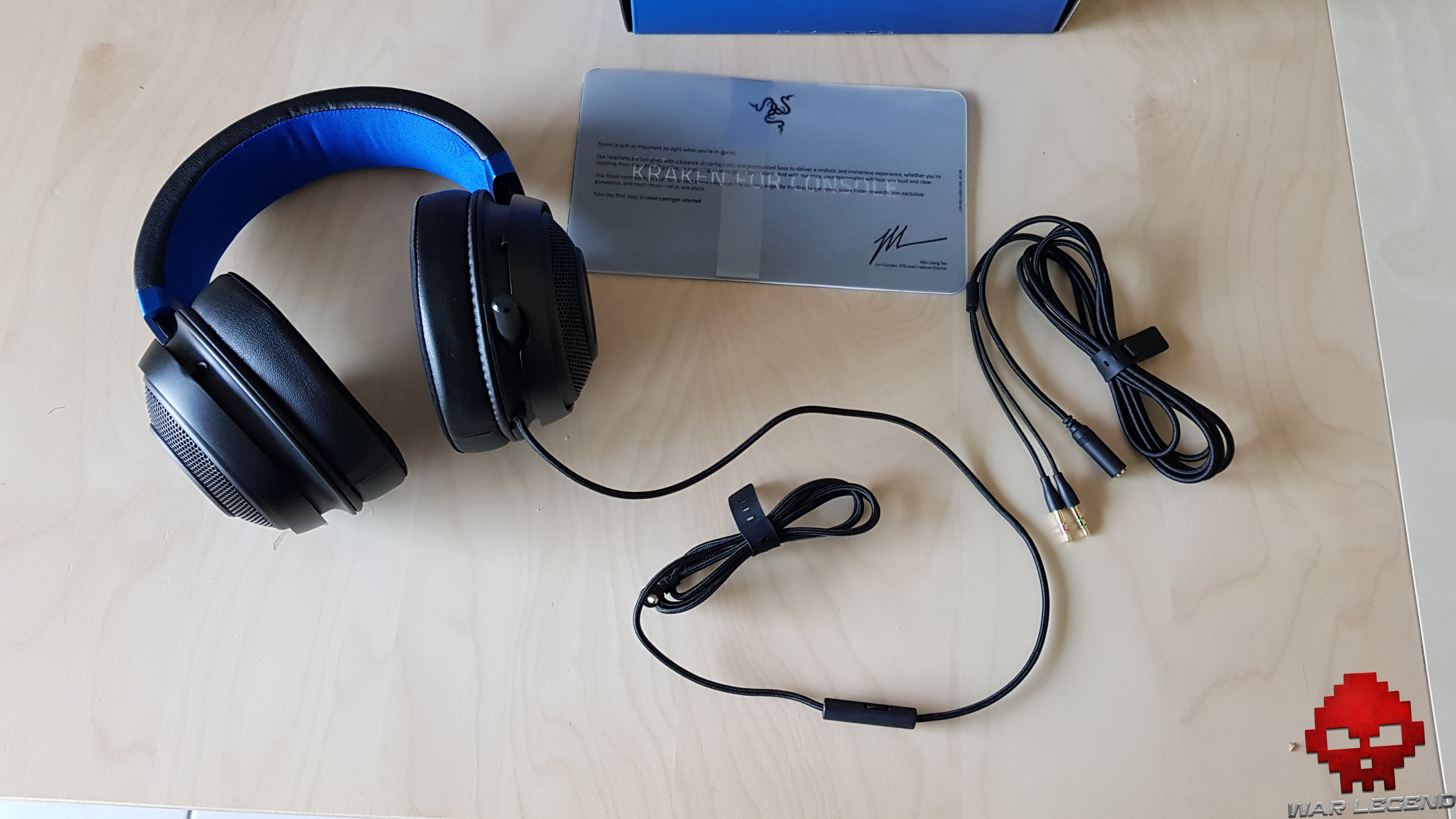 La version révisée du Kraken Pro V2 s’appelle tout simplement Razer Kraken et offre une compatibilité à travers toutes les consoles ainsi que le PC. La boîte s’ouvre tout simplement sur le casque, son câble permettant de dédoubler le jack 3.5 mm pour une utilisation casque + micro ainsi que le petit manuel de rigueur.
