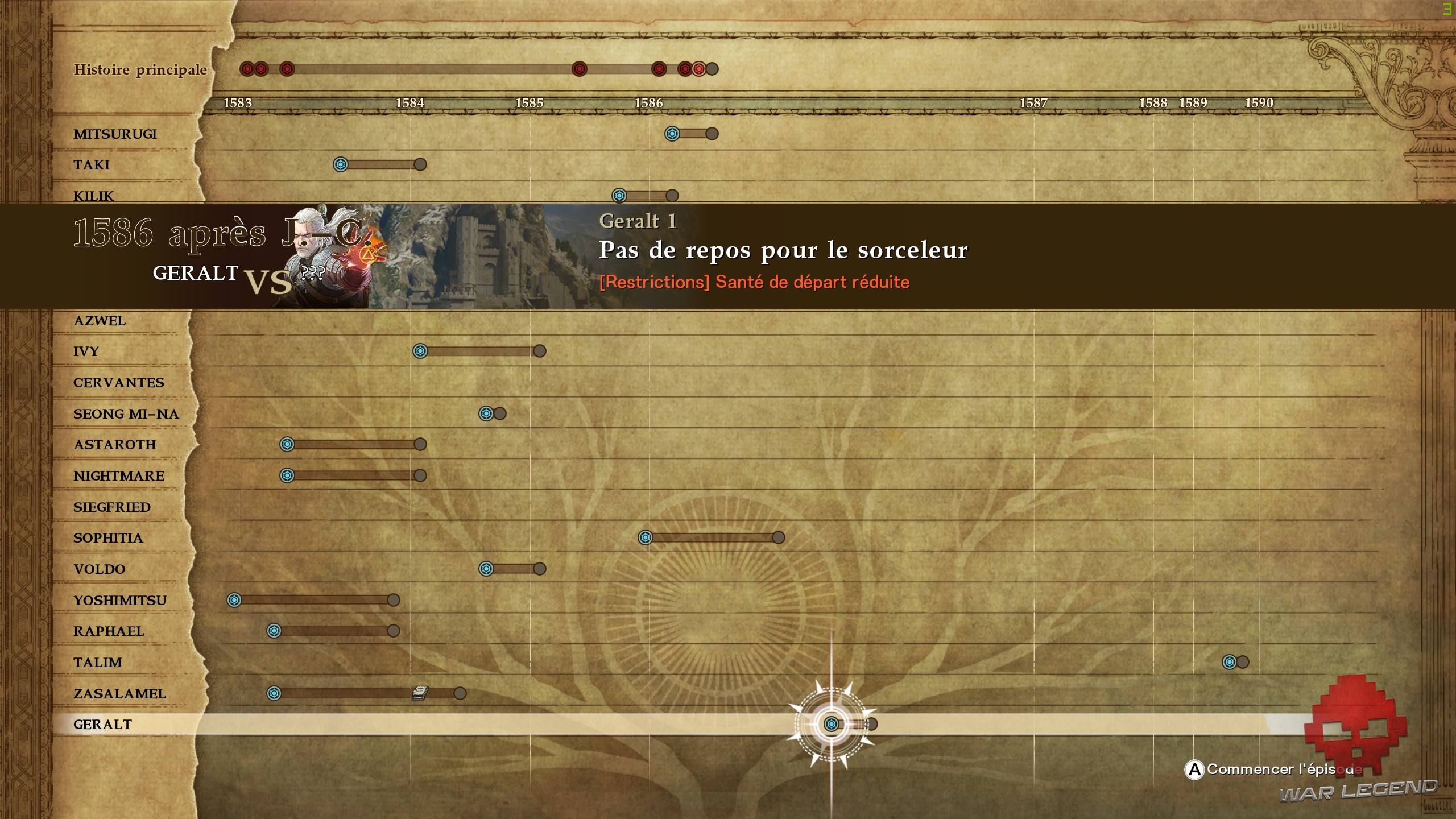 Le premier est Chroniques de l’âme qui est un mode histoire plutôt classique qui narre les péripéties de tous les personnages de la série entre 1583 et 1590. Si ce n’est pas très bien écrit et que les événements s’enchaînent très vite via un visual novel classique entrecoupé de combats, chaque perso possède quand même son instant de gloire. Chaque timeline se termine entre 20 et 30 minutes.
