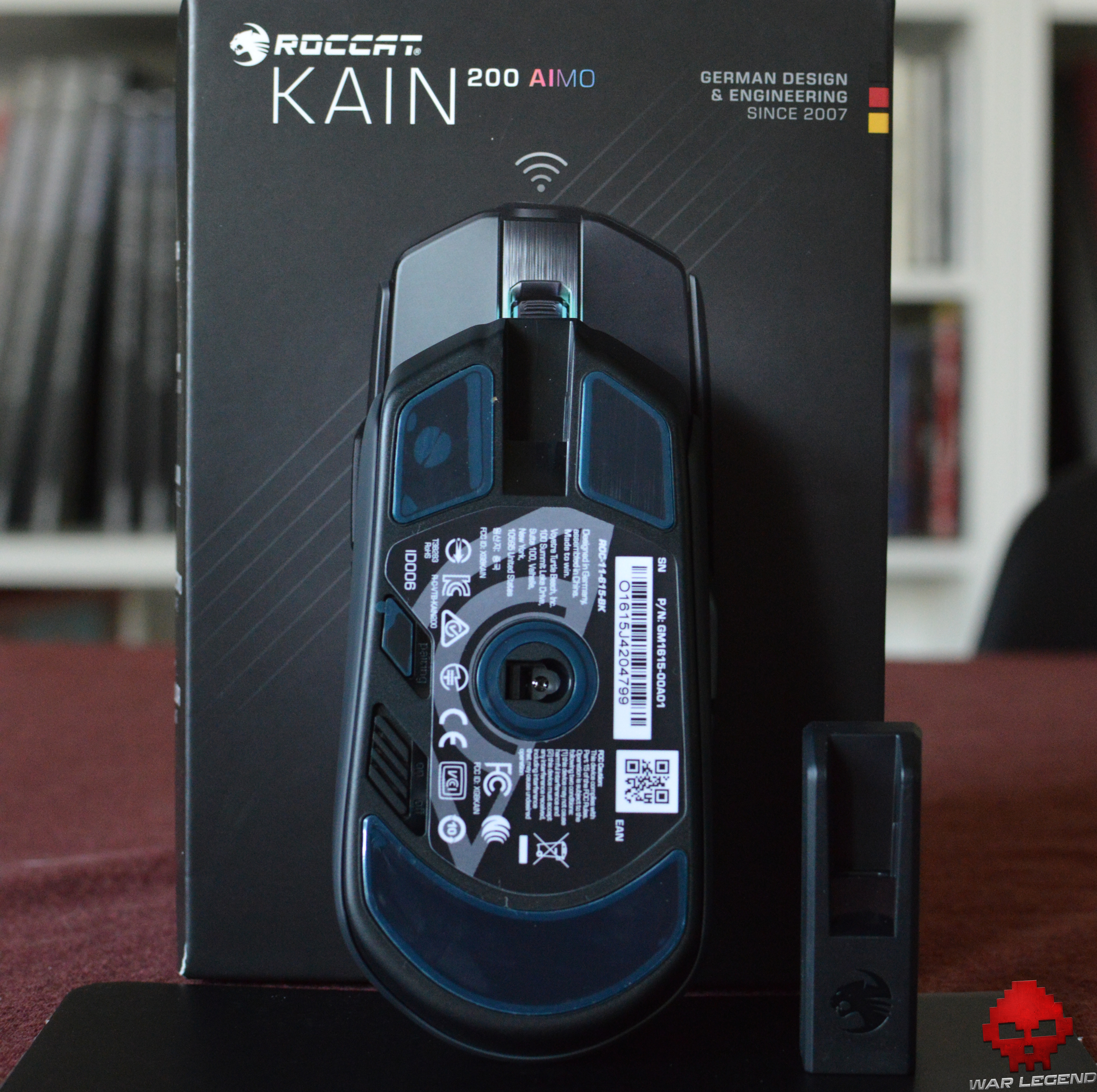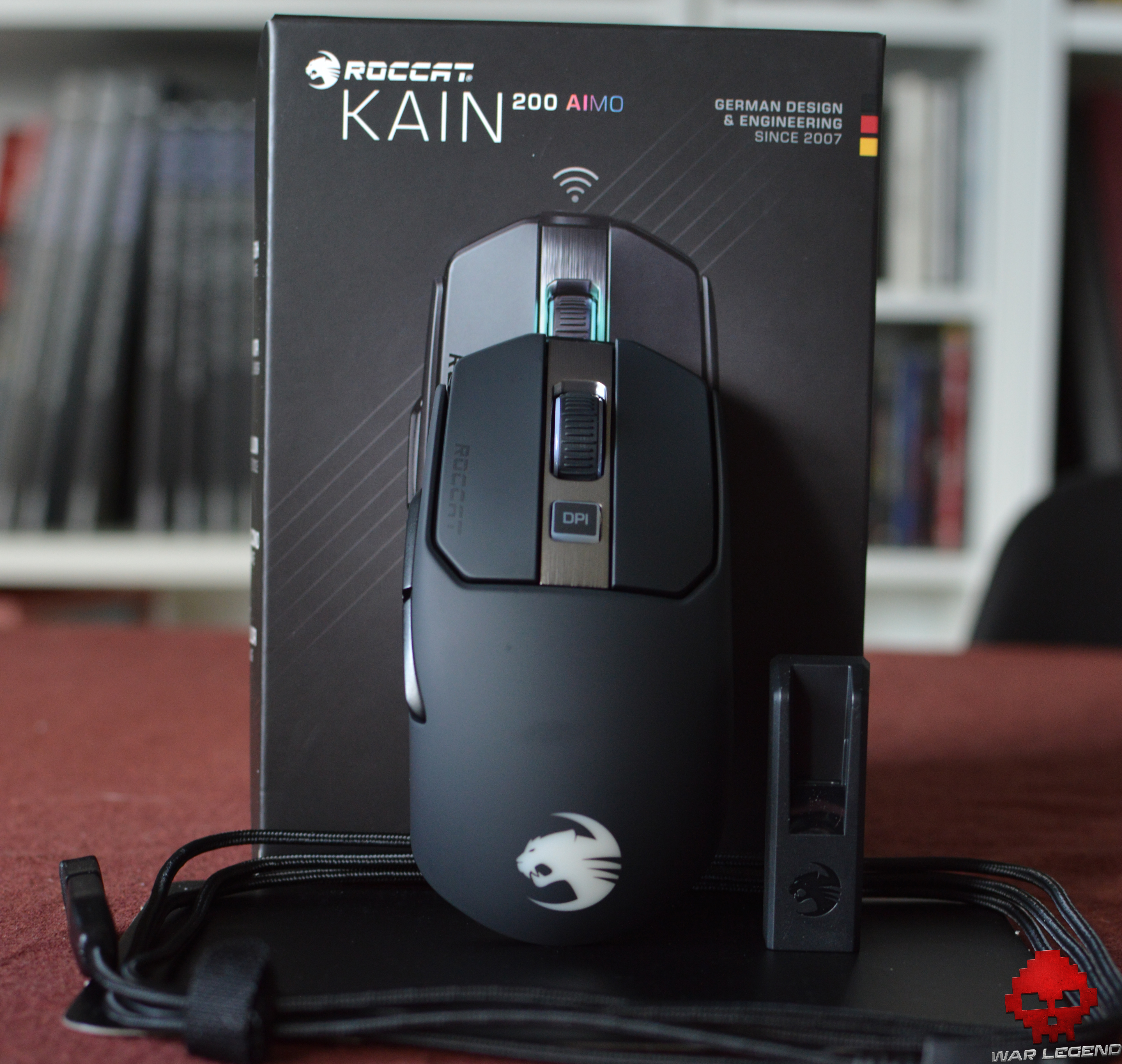 Le Roccat Kain 200 AIMO se présente un peu à l’image de sa boîte : menue. Contrairement à la Roccat Leadr, qui prend pas mal de place, non seulement avec une souris plus imposante, mais aussi et surtout avec une grosse station de base, la Roccat Kain 200 AIMO se montre assez discrète de part ses dimensions (12.40 * 6.50 * 4.30 cm) et son poids (105 g).
