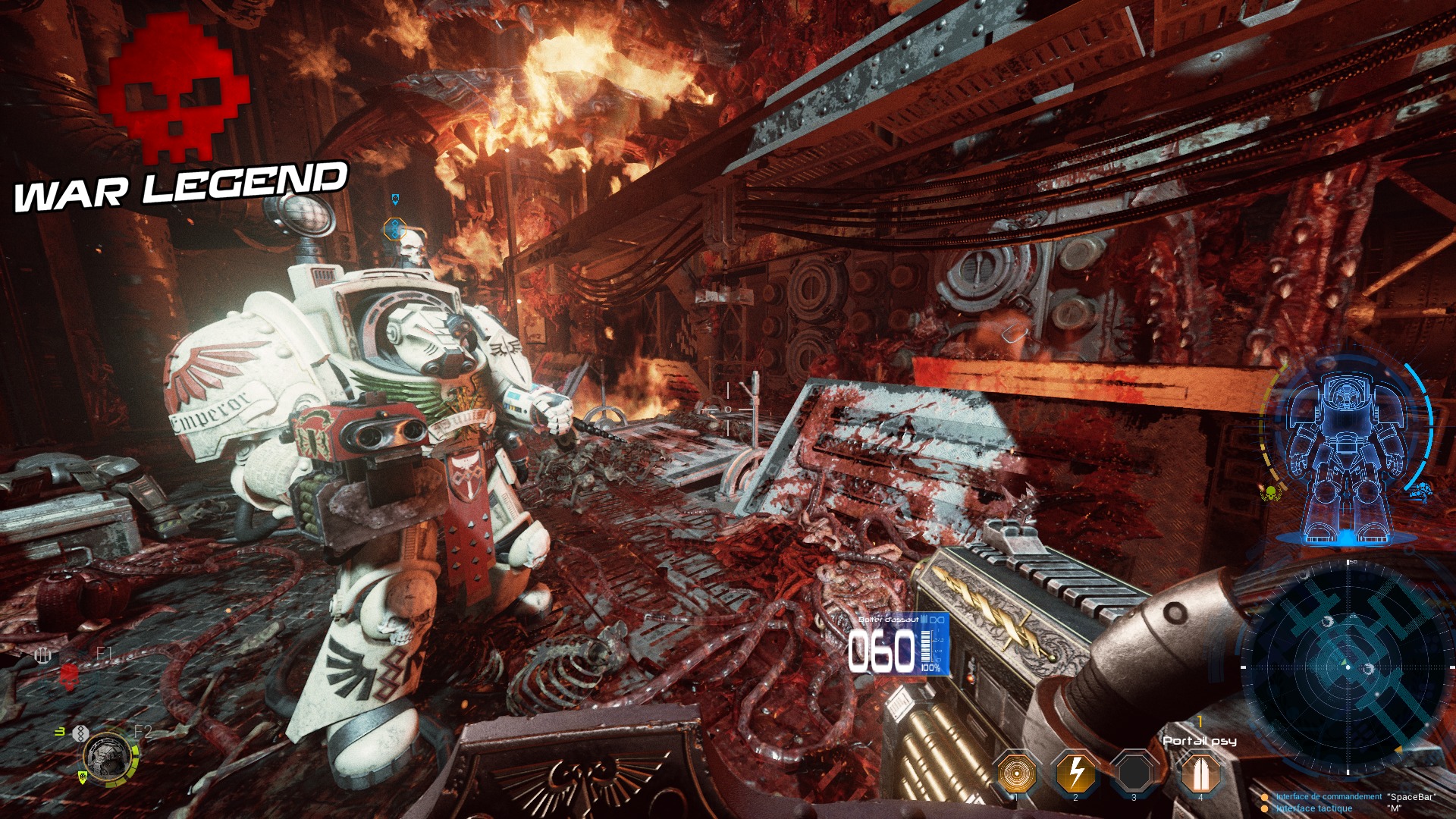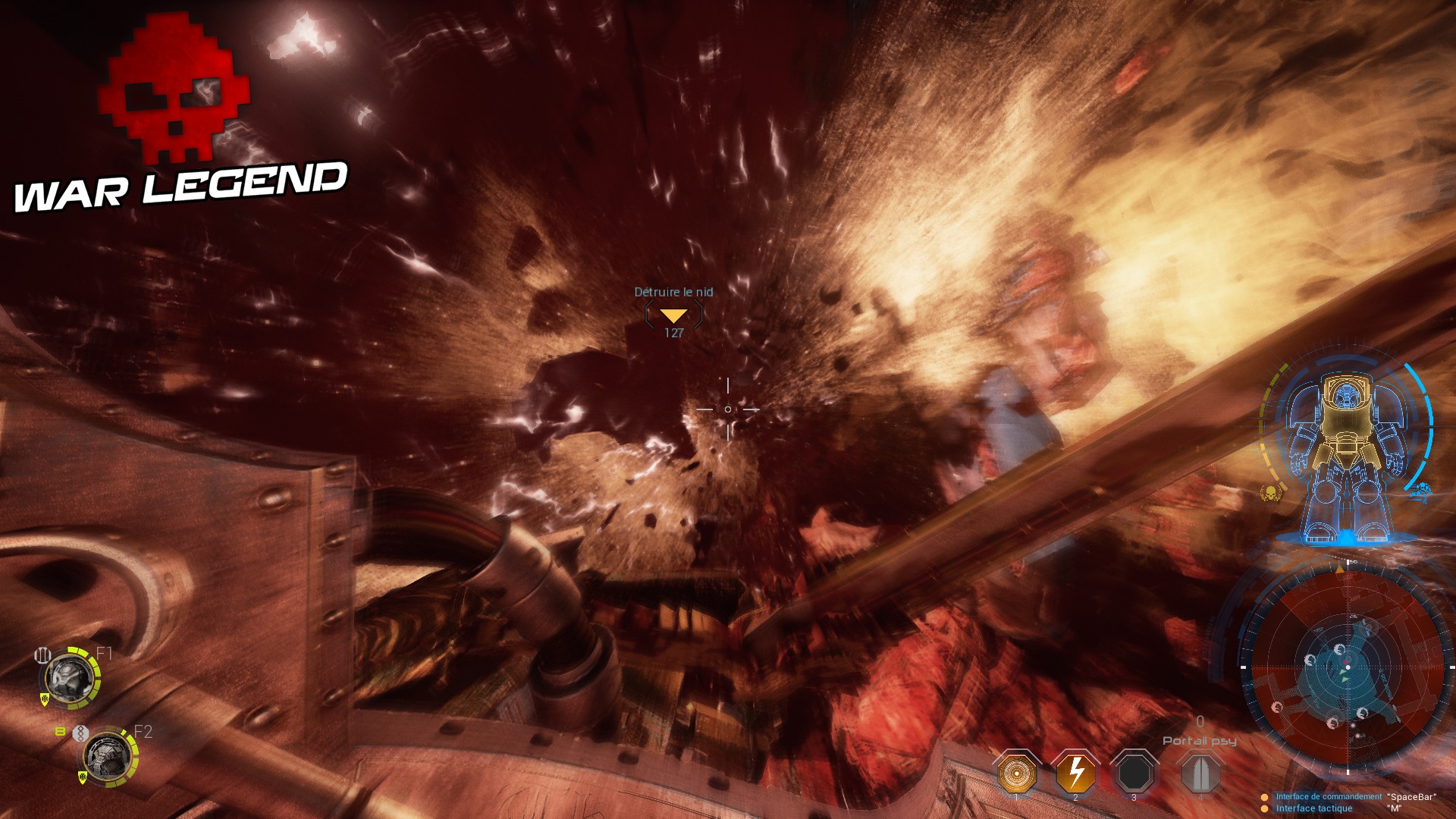 Pour revenir à votre escouade, vous avez la possibilité de donner des ordres à chacun de ses membres afin qu’il réalise une tâche précise. Avancer prudemment est un prérequis important pour éviter d’esquinter son armure Terminator bêtement. Vous pourrez donc commander à vos frères d’ouvrir une porte et d’avancer, ou de fermer la marche en verrouillant derrière vous, empêchant les ennemis de vous prendre à revers. Cependant, tout ça est très laborieux à réaliser, à cause d’une ergonomie largement perfectible. Idem pour les positionnements qui ne servent pas à grand-chose dans le tumulte des combats, qui deviennent alors très bordéliques. Une pause active aurait largement été la bienvenue pour s’assurer de pouvoir couvrir tous les angles.