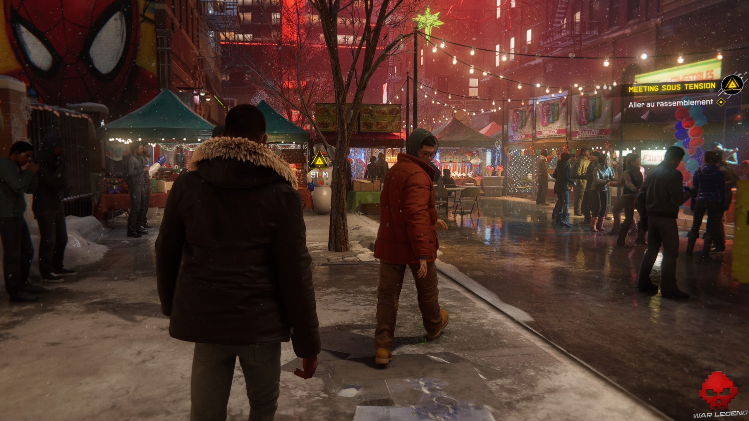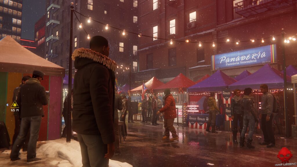 Spider-Man: Miles Morales fourmille de détails qui participent grandement à l’immersion. De ce côté, on voit notamment la neige qui vient se poser sur les habits et fondre avec un naturel bluffant. Le ray-tracing n’est pas en reste avec de belles réflexions dans les flaques d’eau (puisque c’est devenu le nerf de la guerre) et plus généralement dans la plupart des surfaces réfléchissantes.